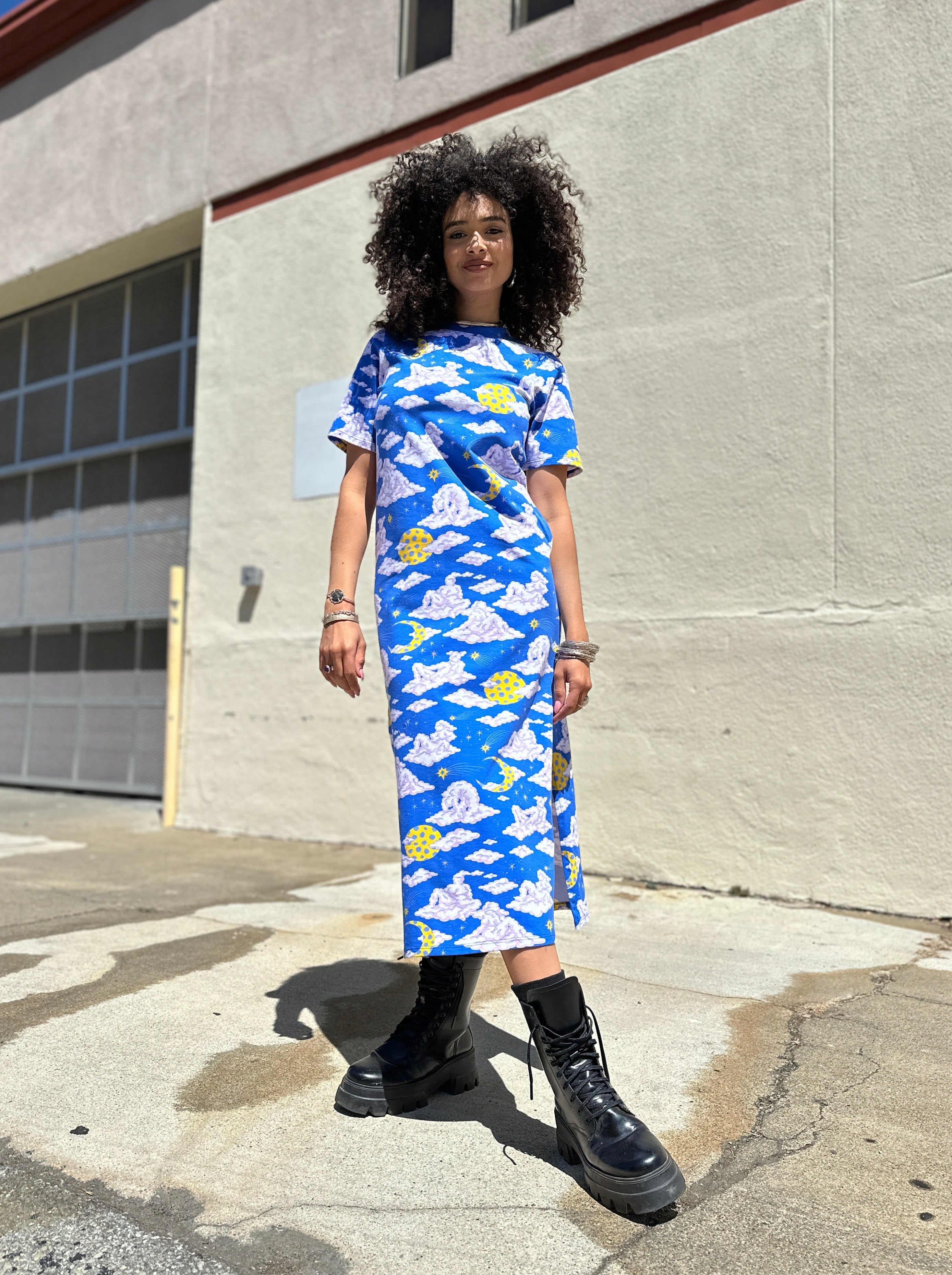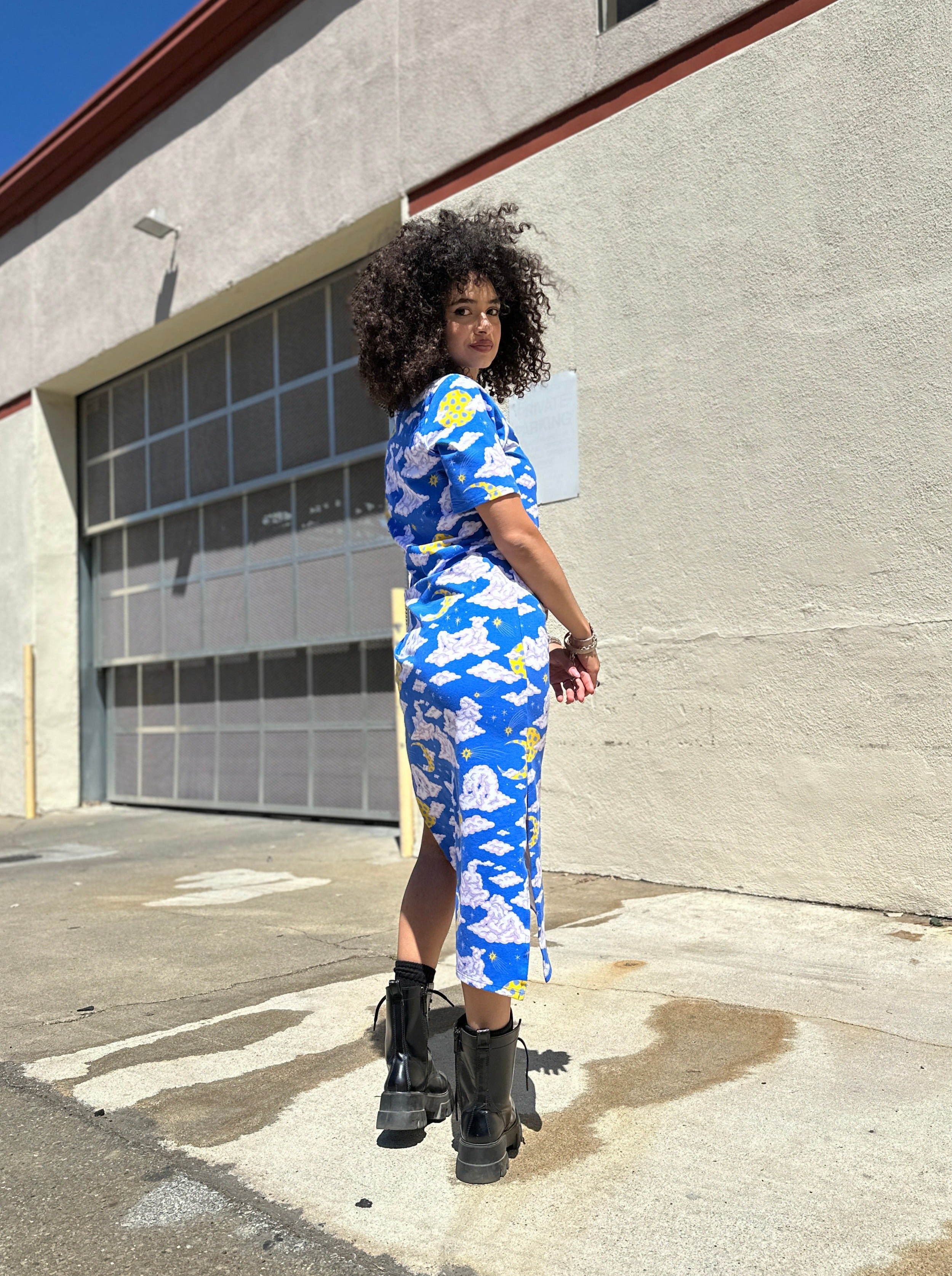 We are a woman owned, women run business. We make limited edition textiles with artists we love in cuts to make you look and feel good. All our garments are produced in California. We try to source all our materials in the USA and work with incredibly nice people.