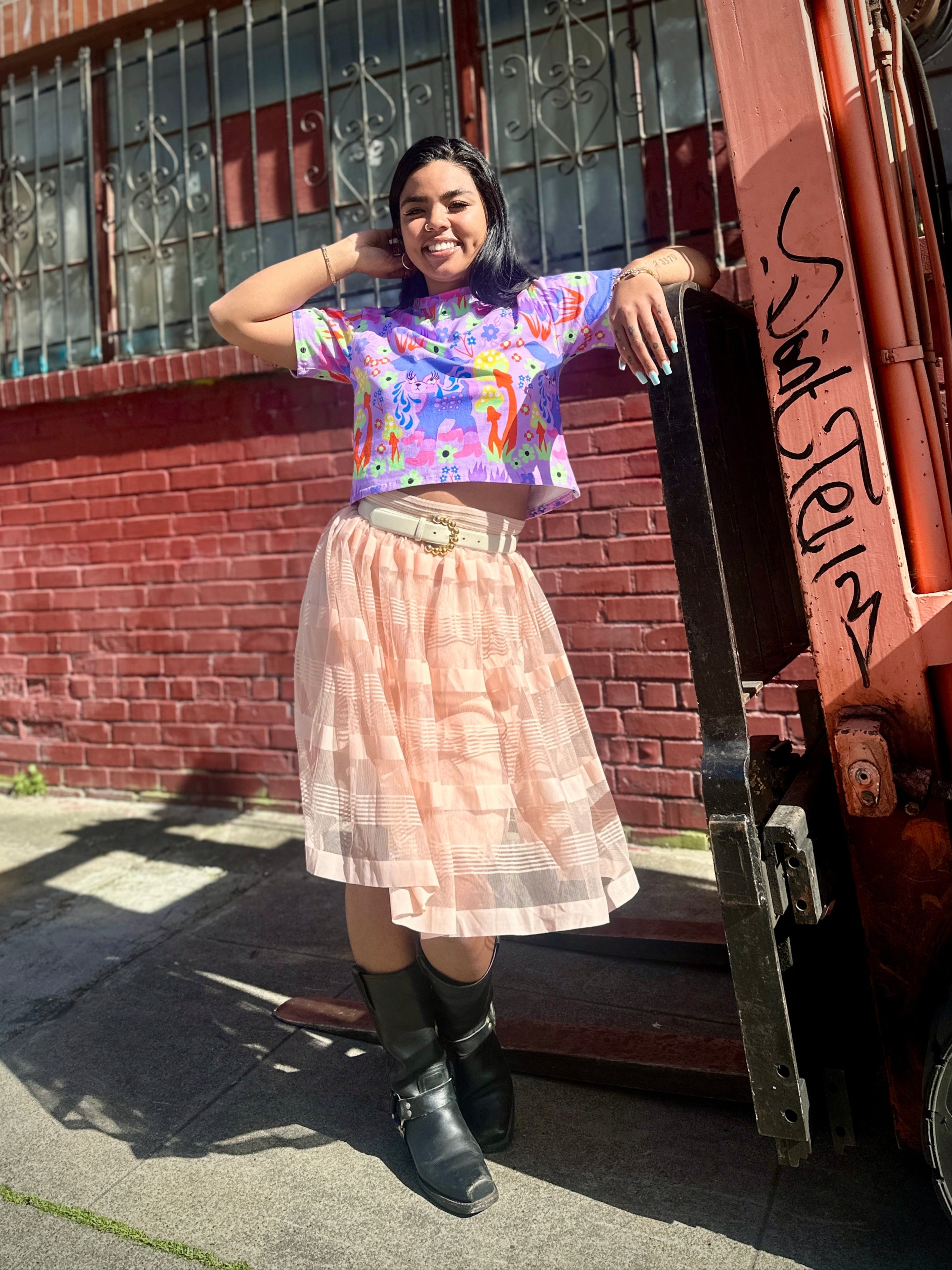 We are a woman owned, women run business. We make limited edition textiles with artists we love in cuts to make you look and feel good. All our garments are produced in California. We try to source all our materials in the USA and work with incredibly nice people.