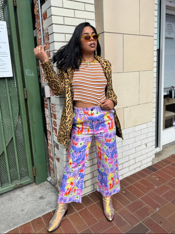 We are a woman owned, women run business. We make limited edition textiles with artists we love in cuts to make you look and feel good. All our garments are produced in California. We try to source all our materials in the USA and work with incredibly nice people.