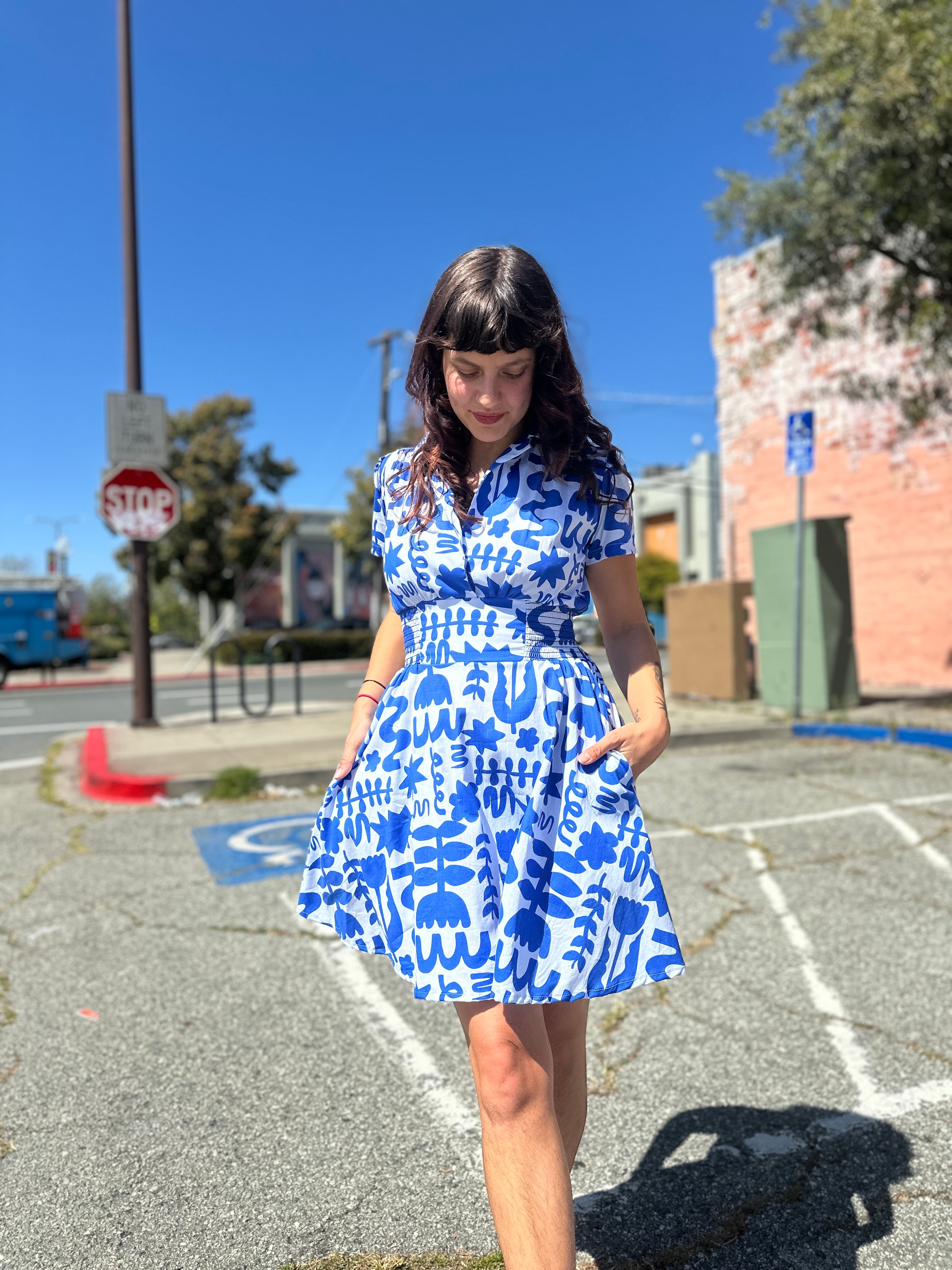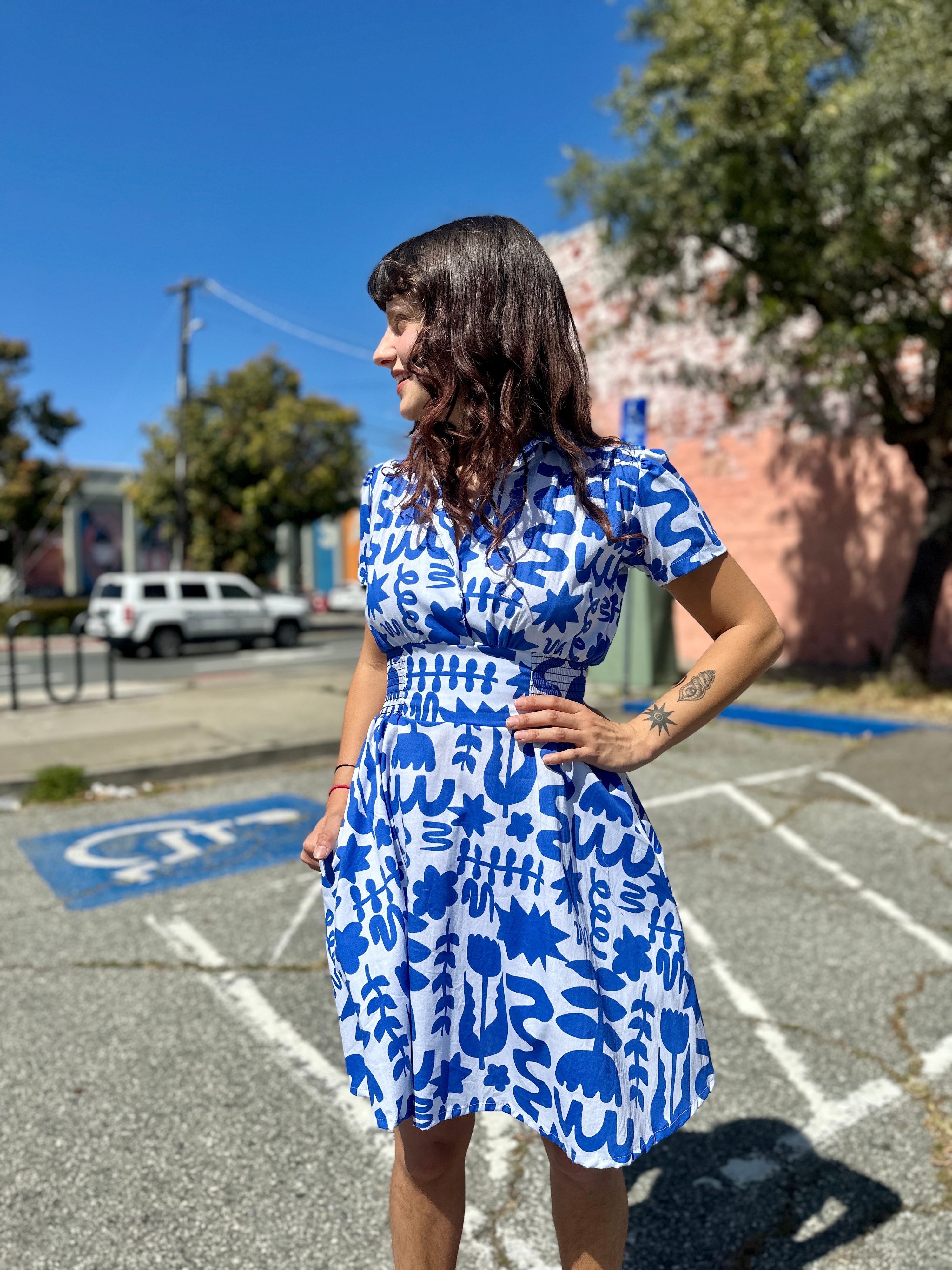 We measure each of our garments by hand, unstretched and laying flat. Our cotton poplin has a just small amount of give (about an inch) but the waistline on this dress is elastic and is made to stretch substantially. Please consult the size guide below to find the best fit for you!