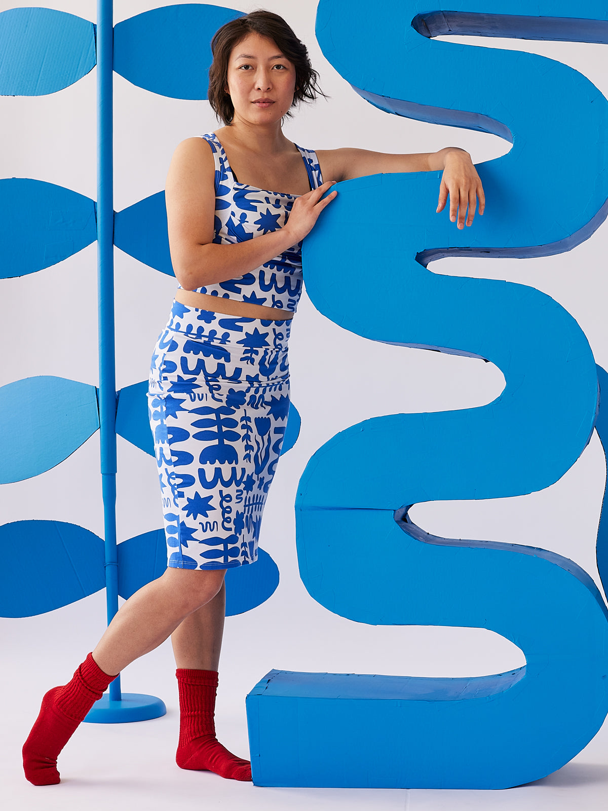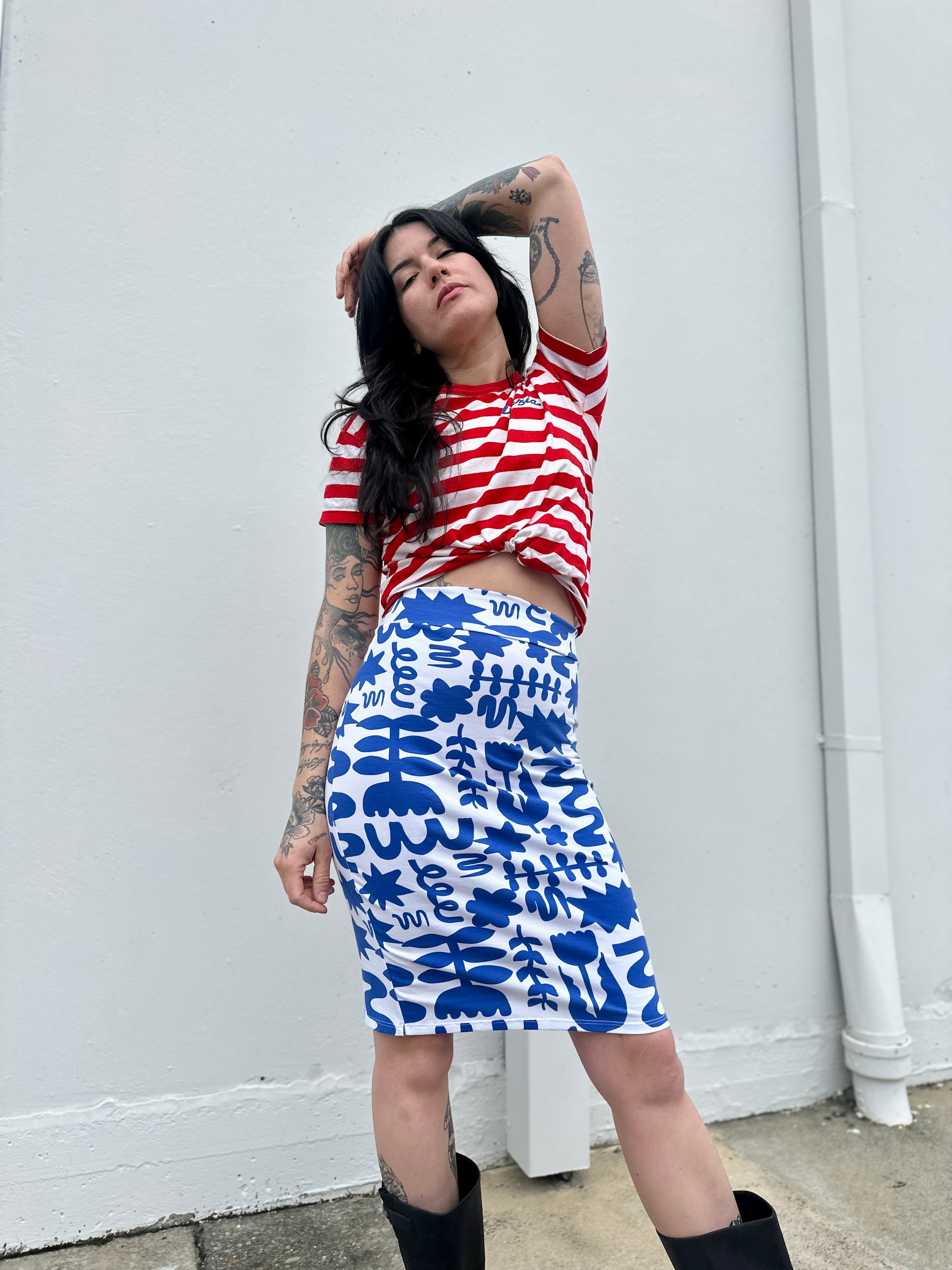 We are a woman owned, women run business. We make limited edition textiles with artists we love in cuts to make you look and feel good. All our garments are produced in California. We try to source all our materials in the USA and work with incredibly nice people.