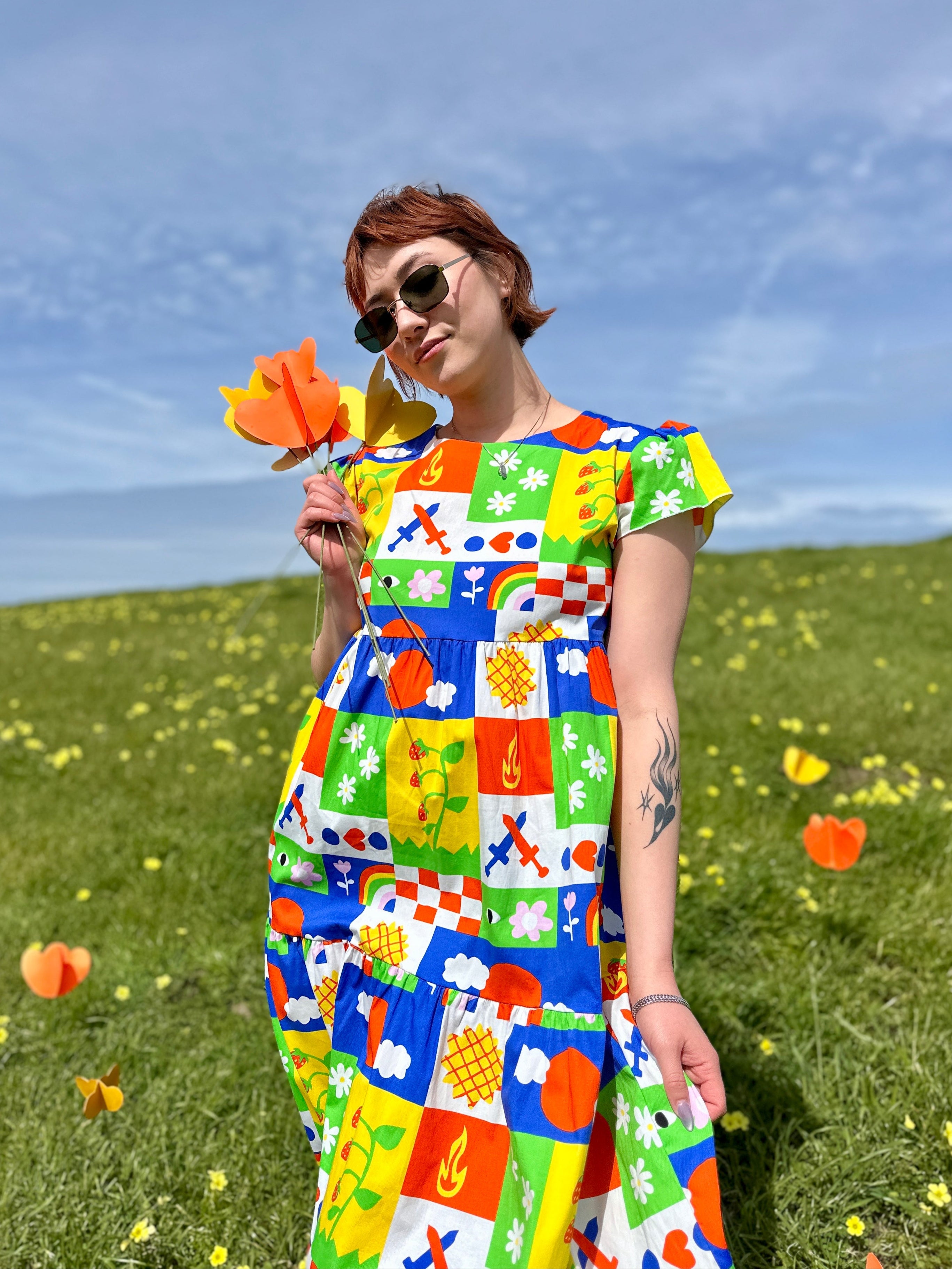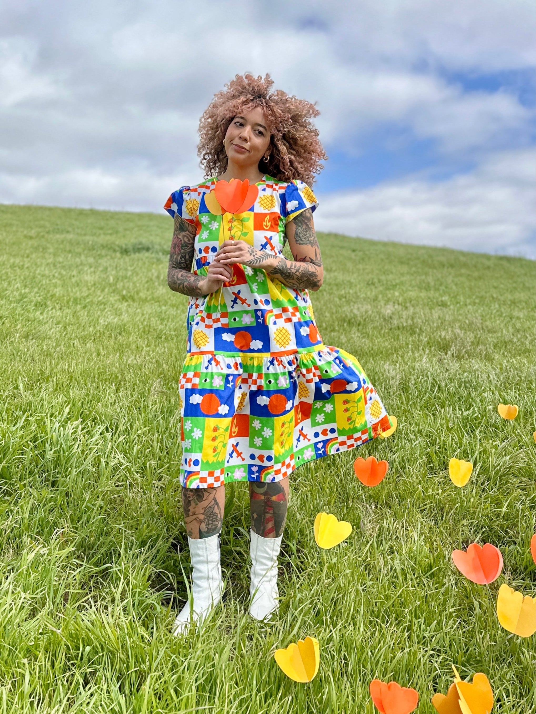 We are a woman owned, women run business. We make limited edition textiles with artists we love in cuts to make you look and feel good. All our garments are produced in California. We try to source all our materials in the USA and work with incredibly nice people.