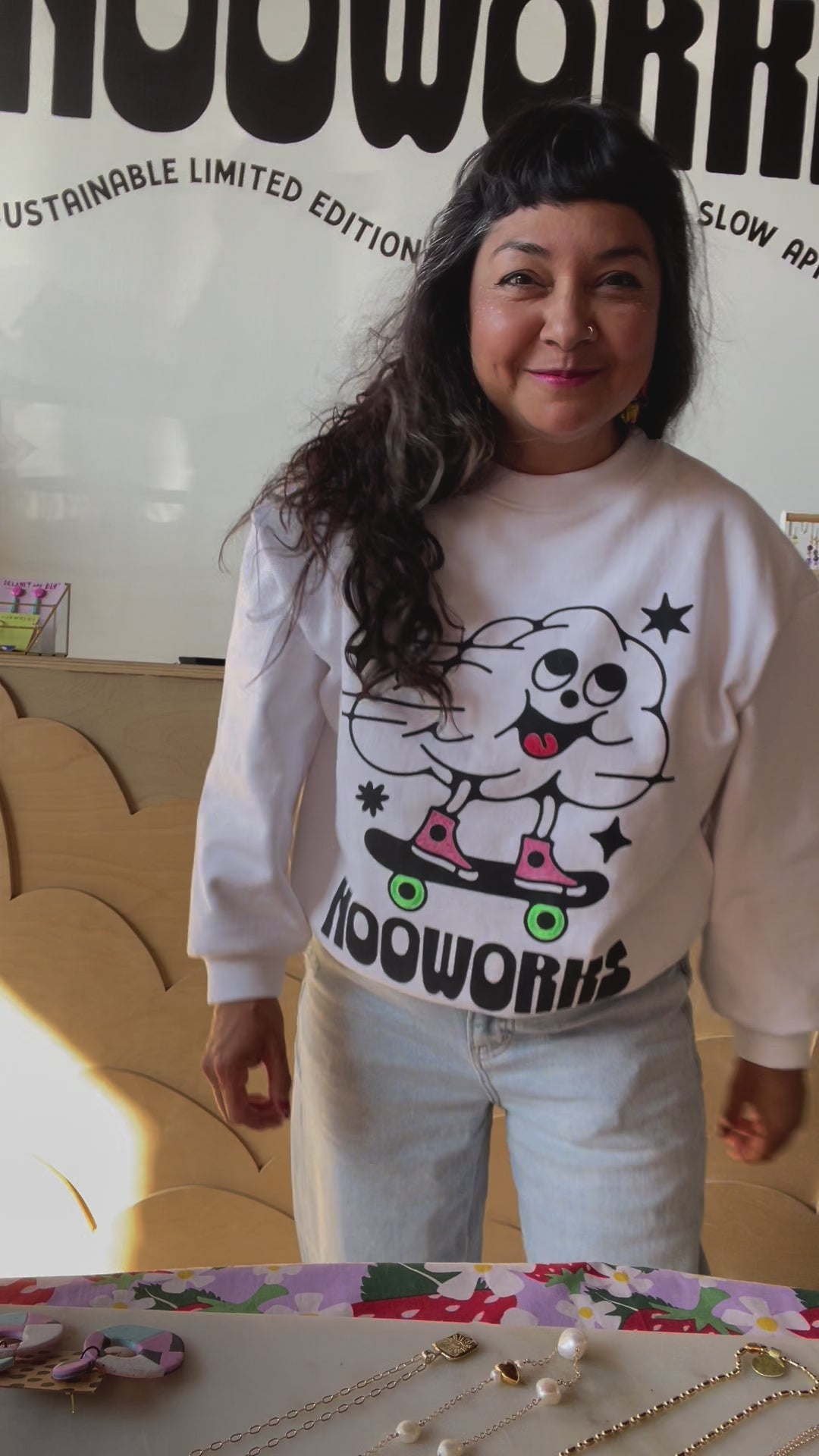 This is the oversized crewneck of our dreams! Custom knit, heavyweight, and ultra-soft featuring the Nooworks skater guy logo by Krista Perry. Manufactured in LA...
