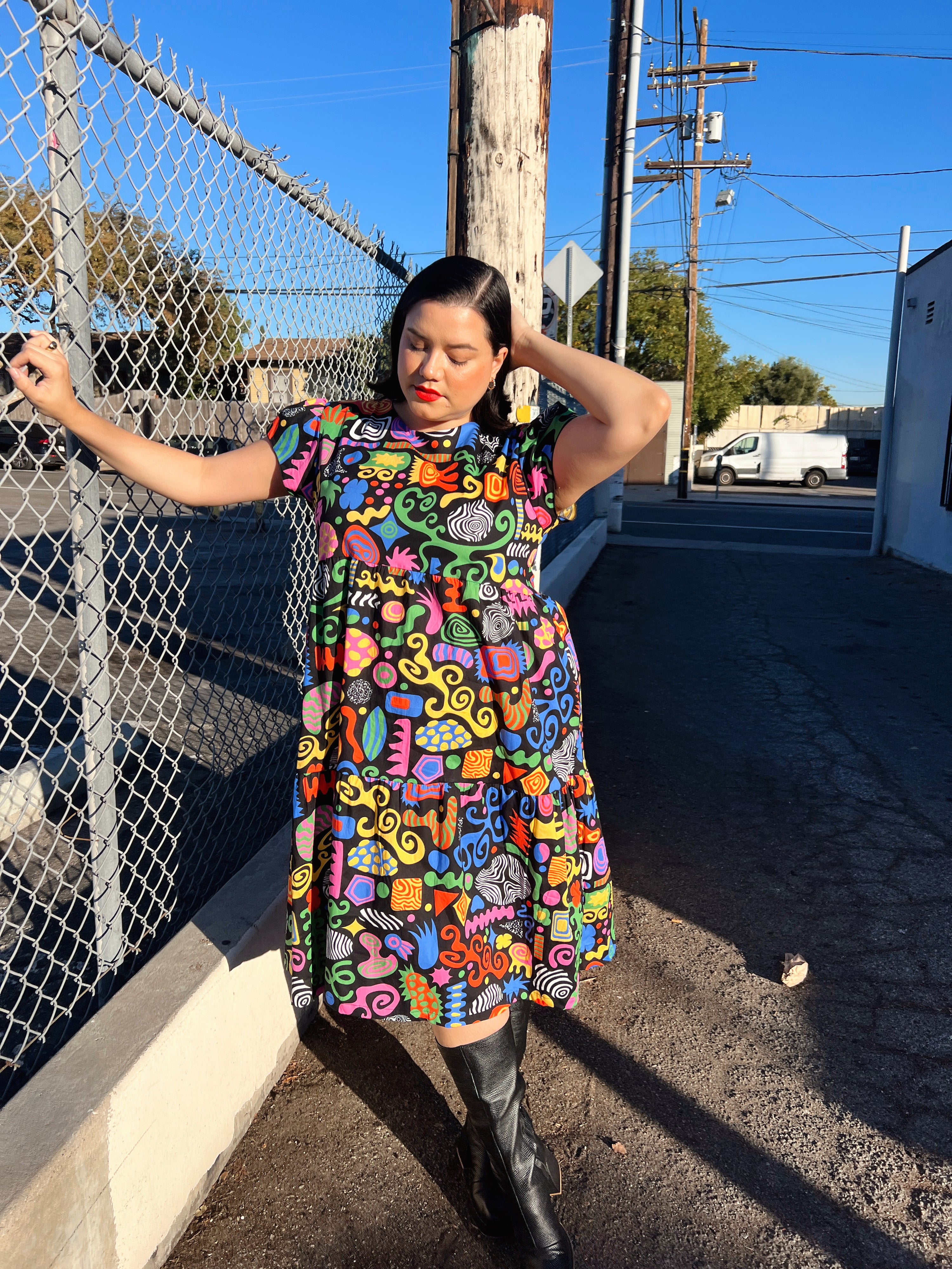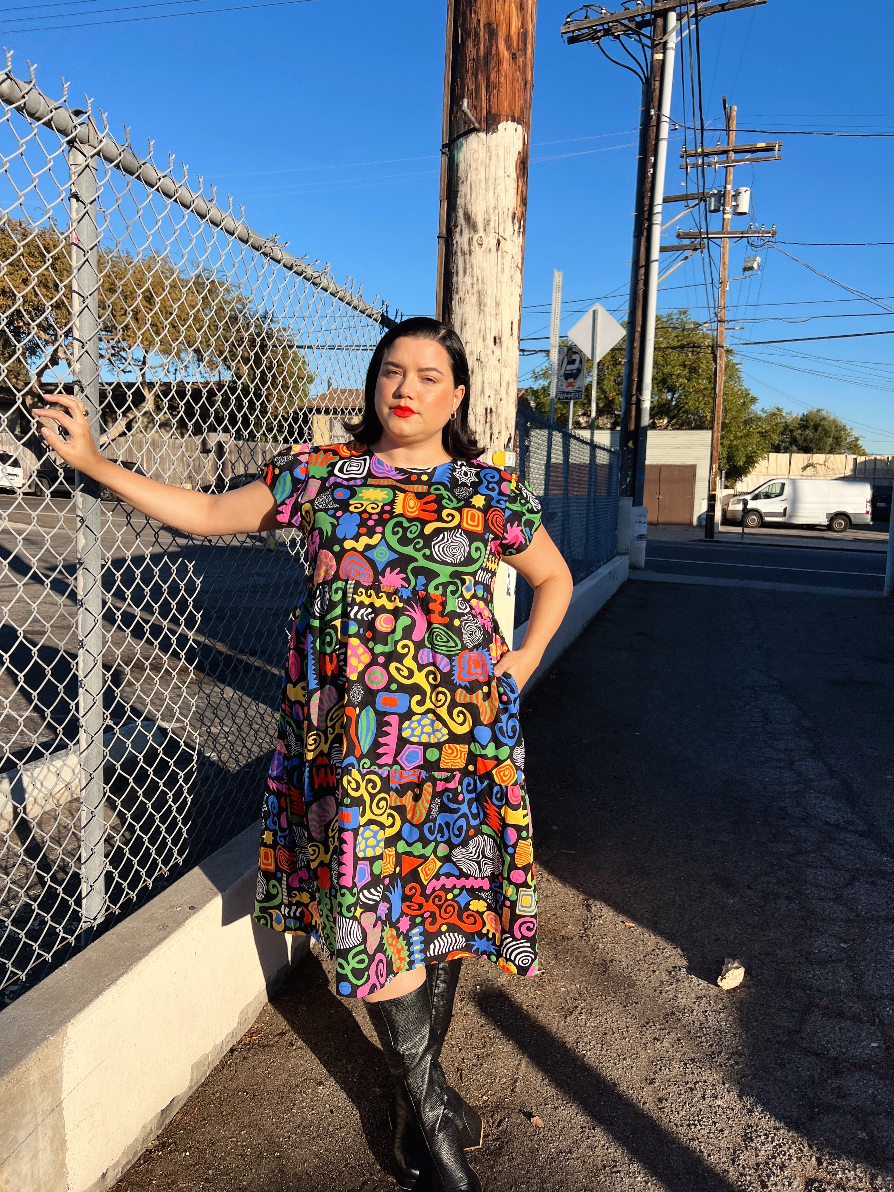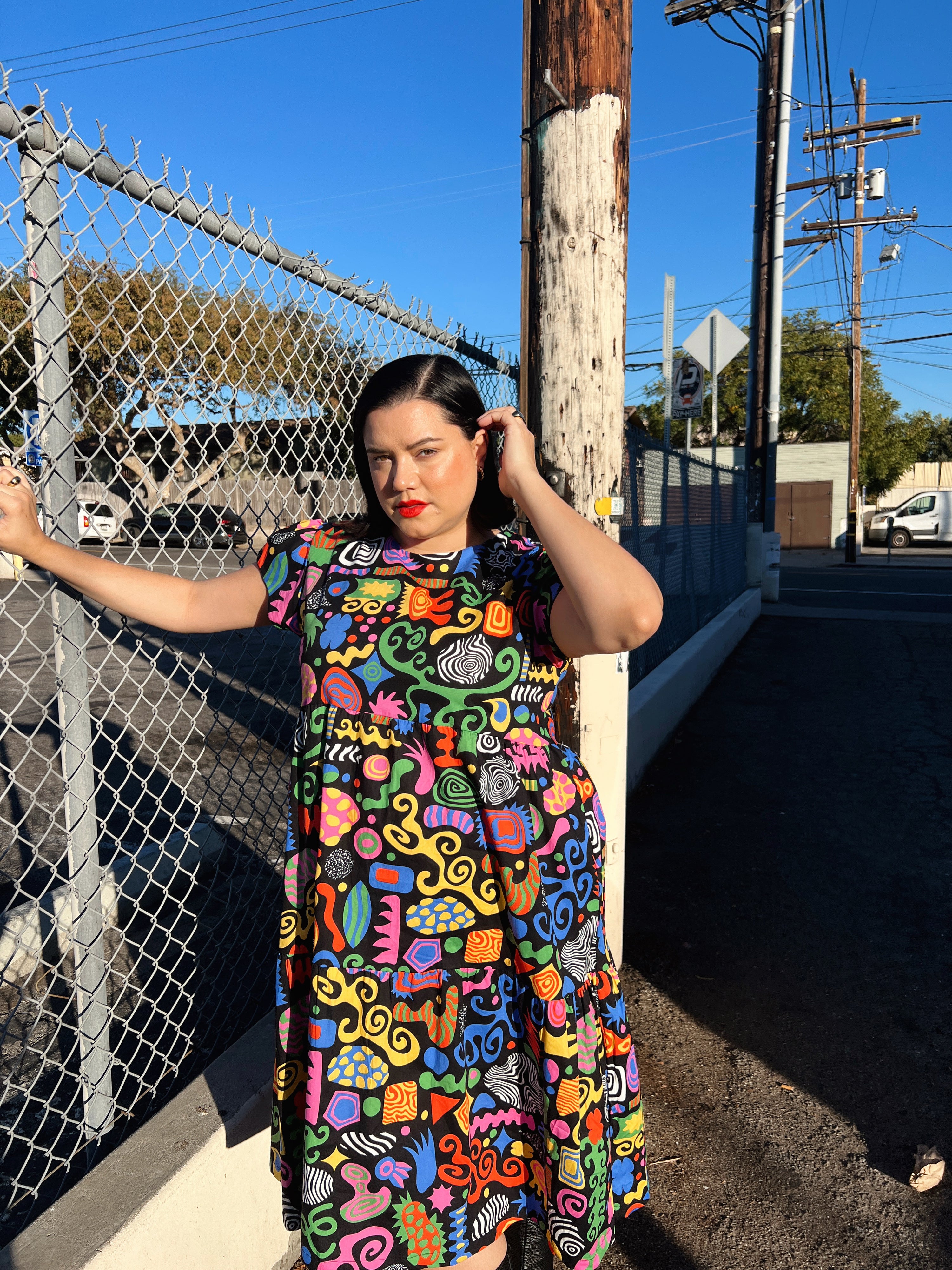 We are a woman owned, women run business. We make limited edition textiles with artists we love in cuts to make you look and feel good. All our garments are produced in California. We try to source all our materials in the USA and work with incredibly nice people.