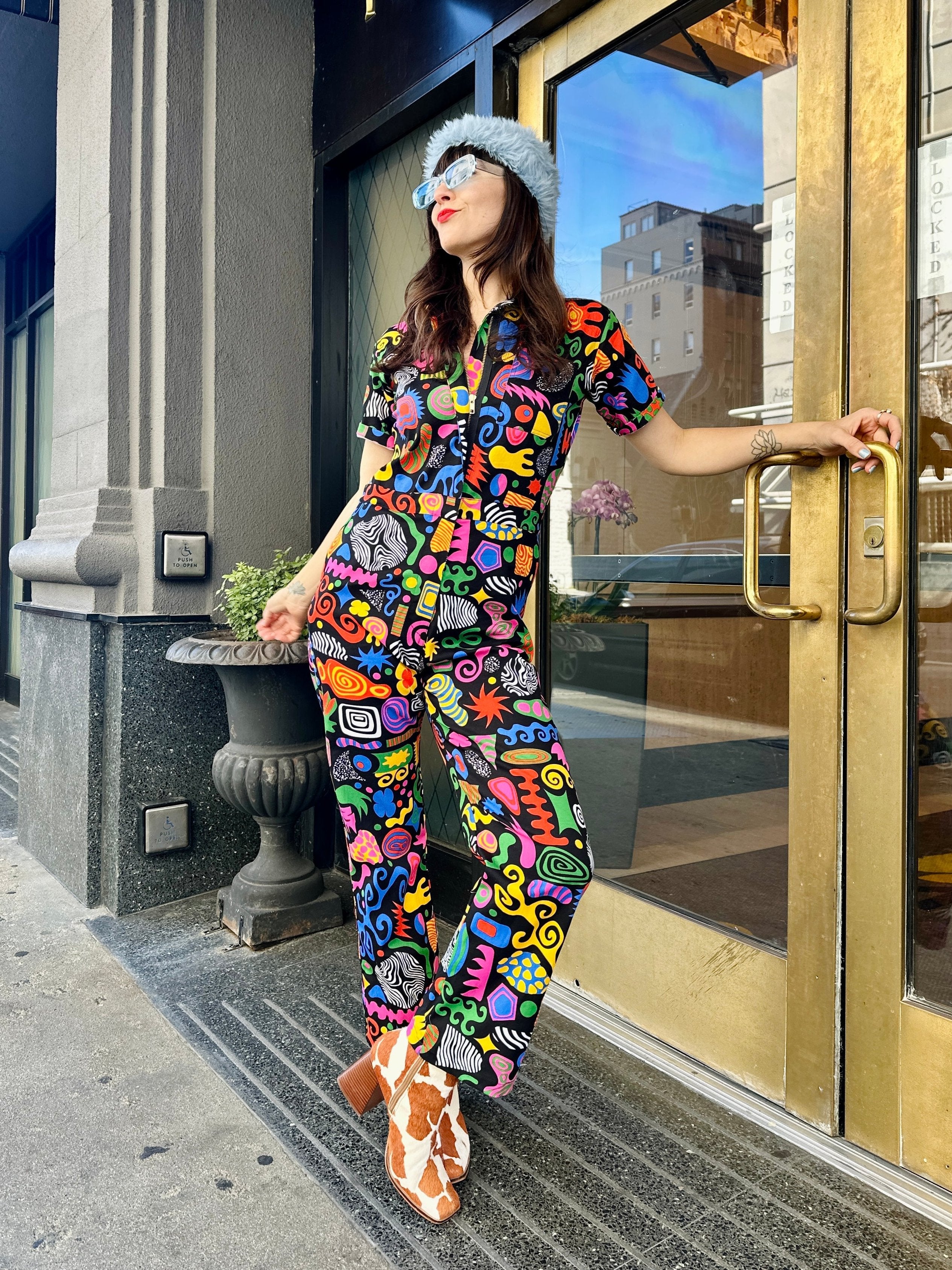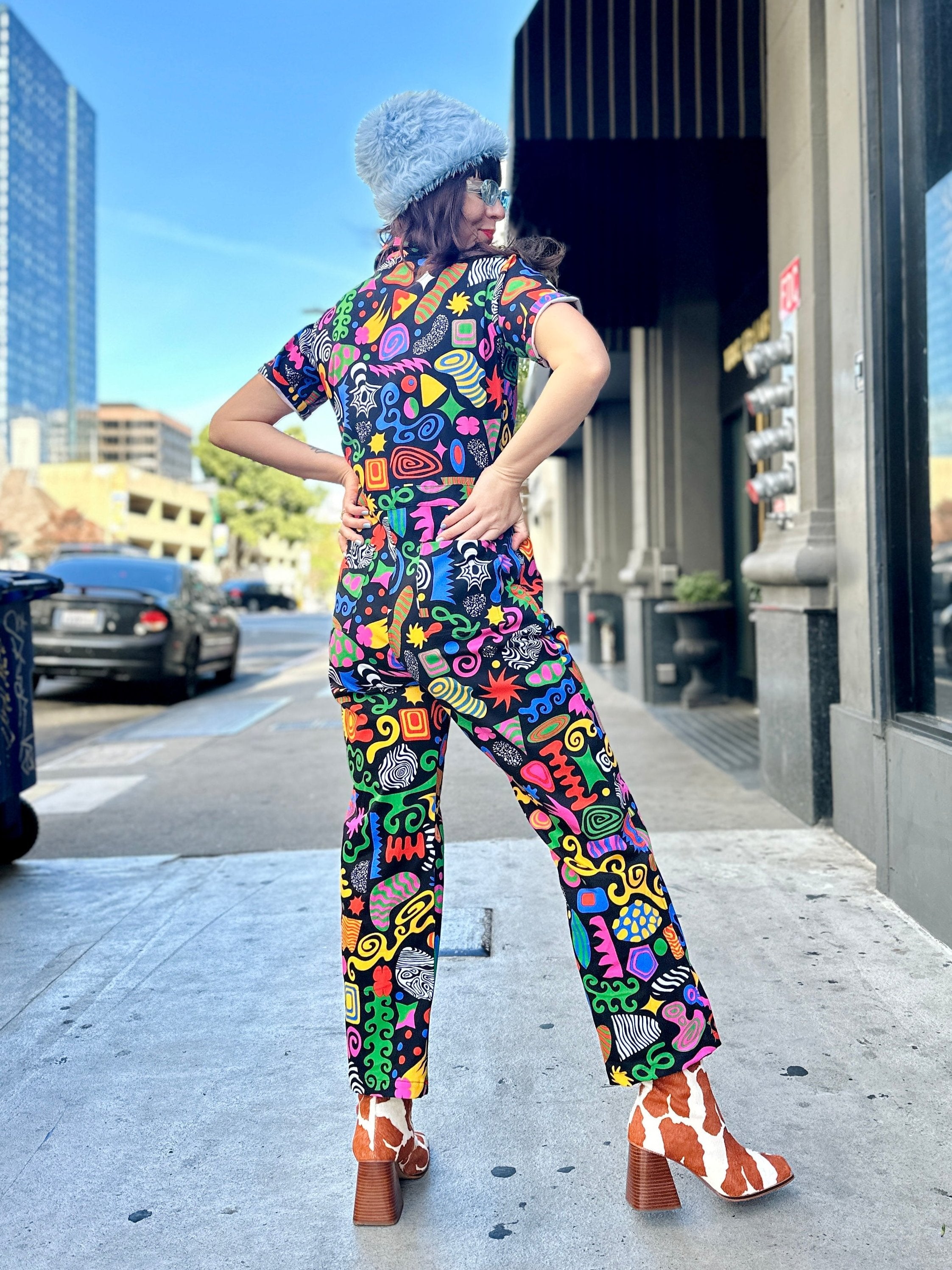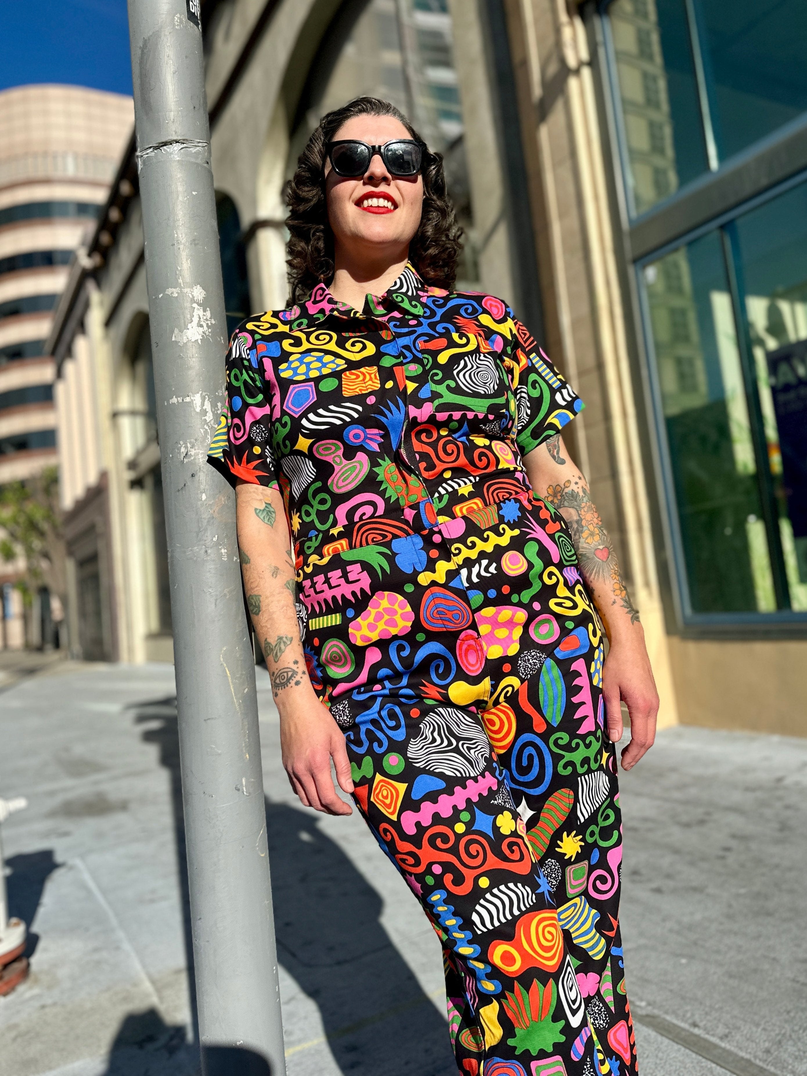 We are a woman owned, women run business. We make limited edition textiles with artists we love in cuts to make you look and feel good. All our garments are produced in California. We try to source all our materials in the USA and work with incredibly nice people.