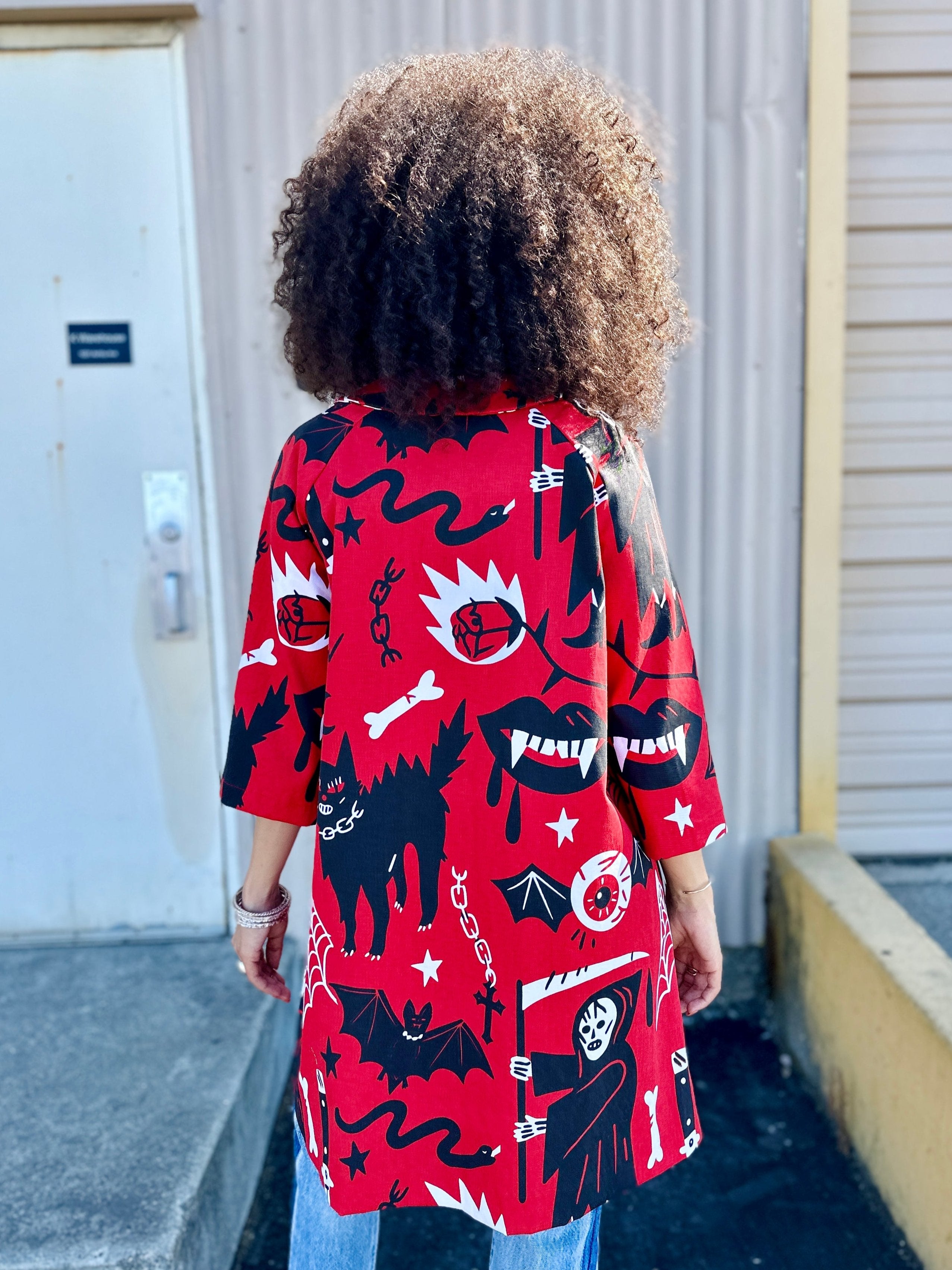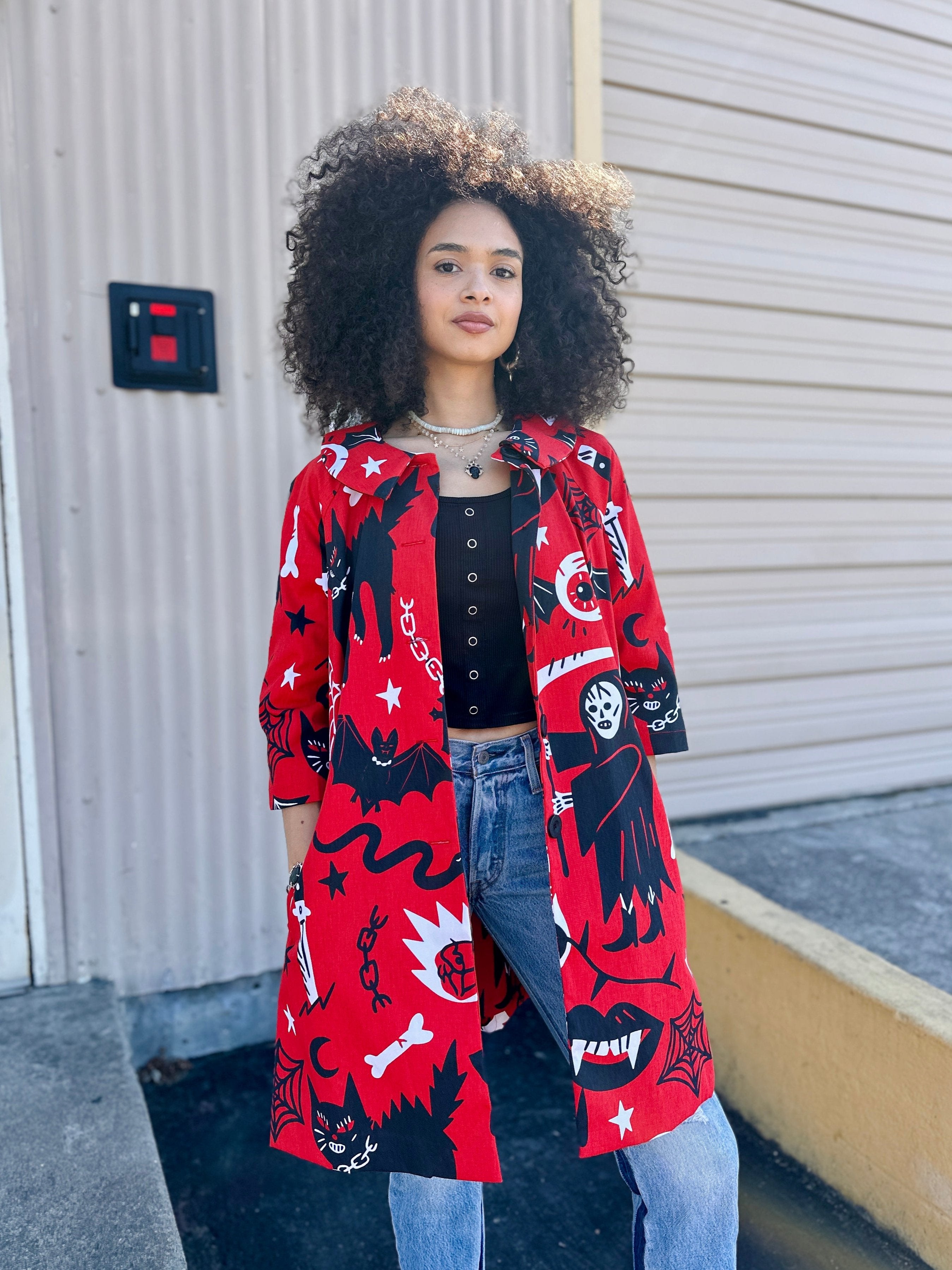 The Shelley Coat has a loose A-line silhouette (think pyramid shape). Reference the size chart for shoulder, bust and overall length to find the best fit for you!