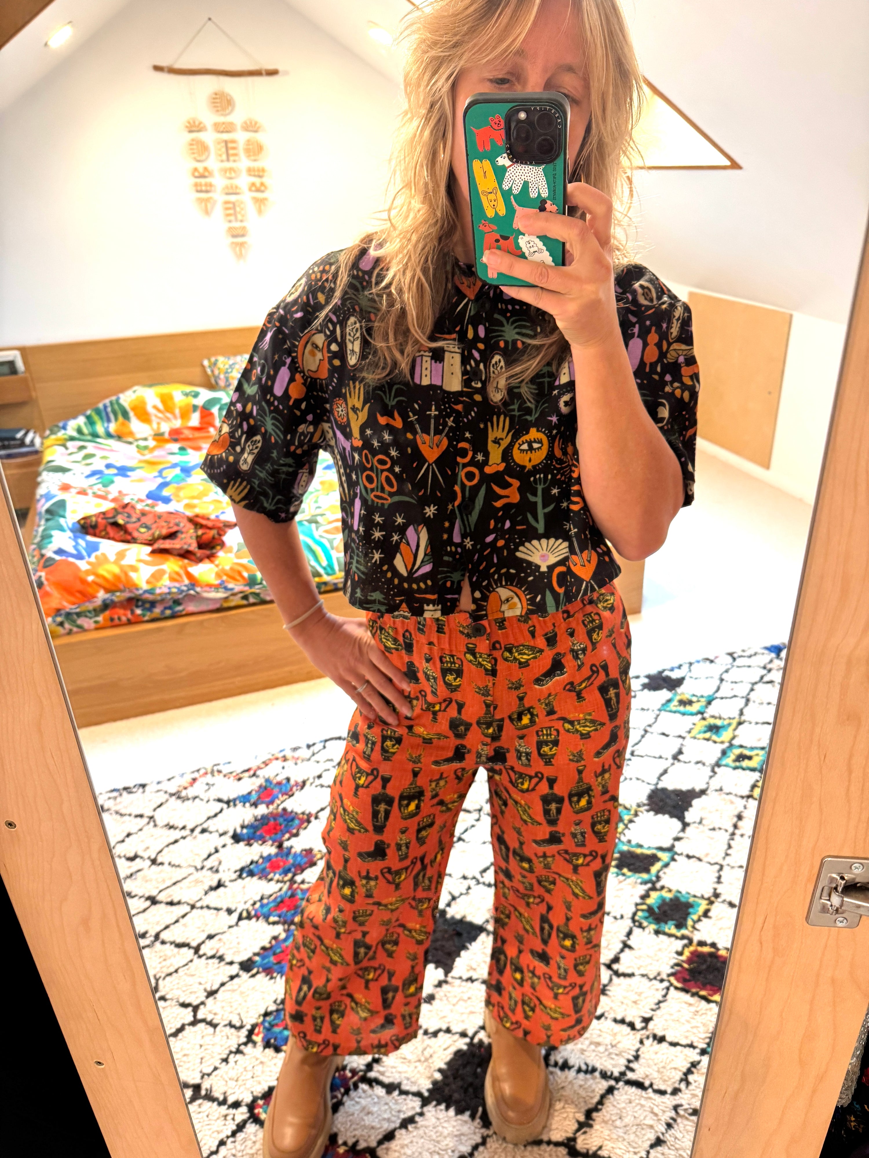 We are a woman owned, women run business. We make limited edition textiles with artists we love in cuts to make you look and feel good. All our garments are produced in California. We try to source all our materials in the USA and work with incredibly nice people.