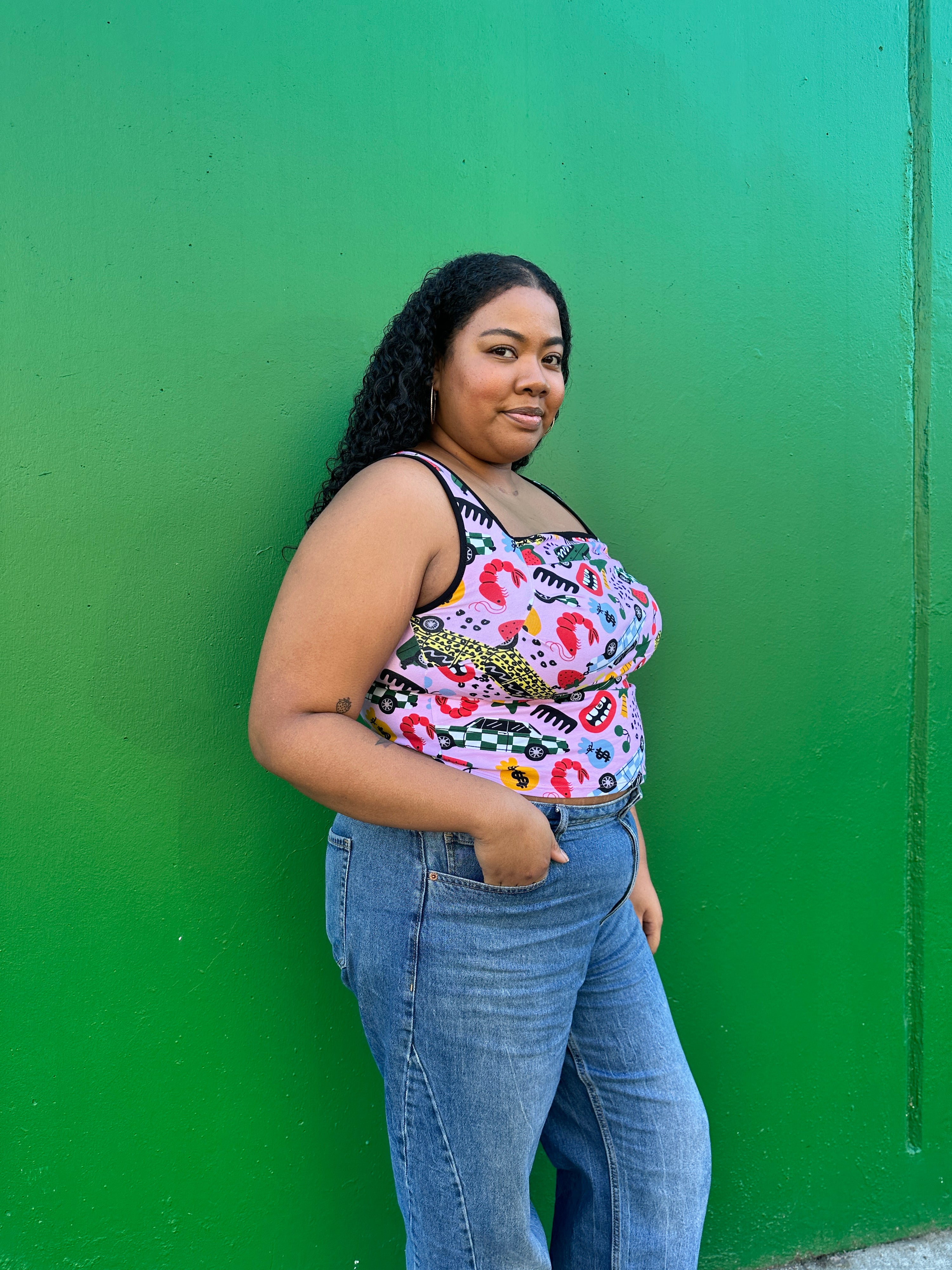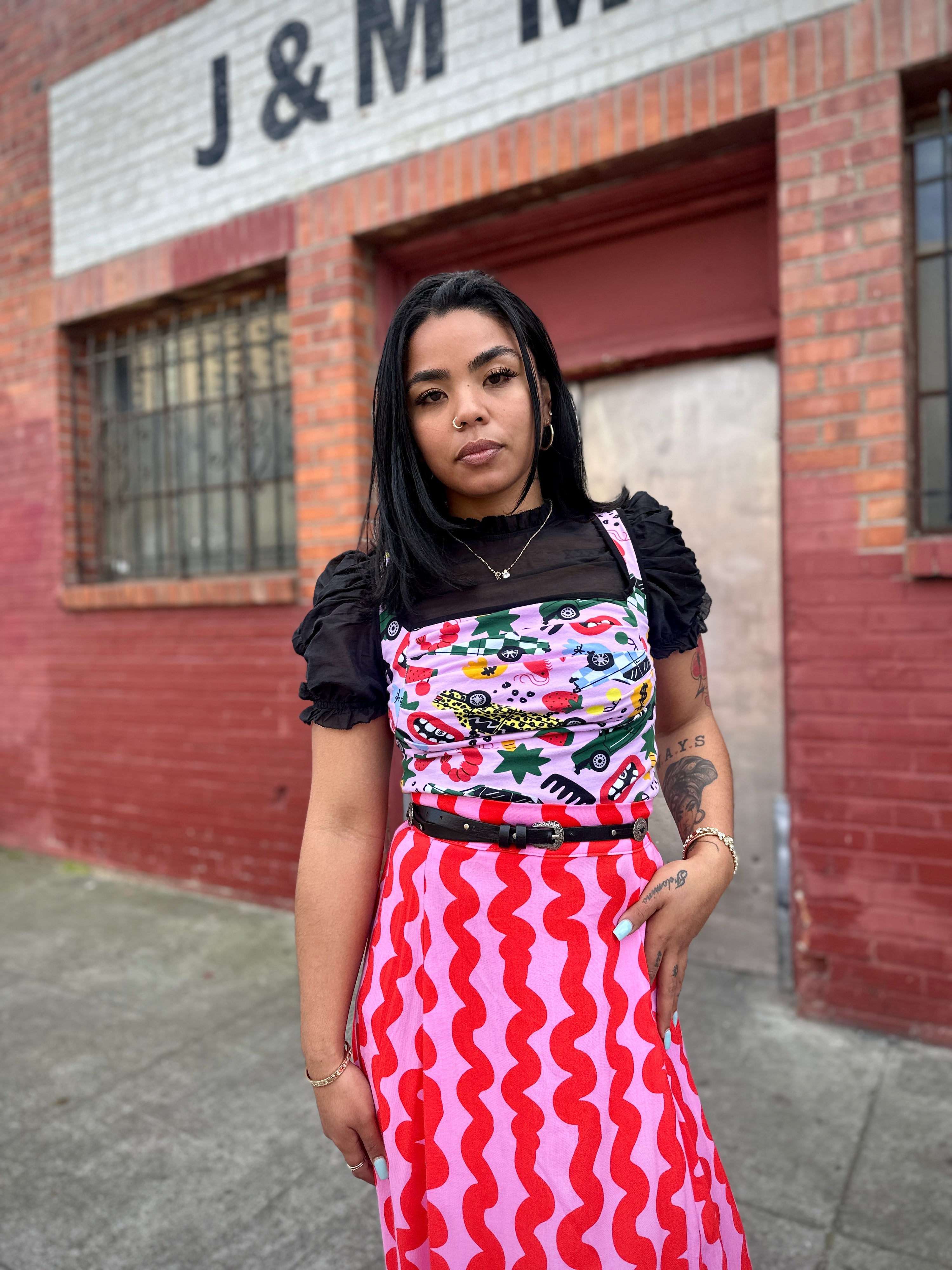 We are a woman owned, women run business. We make limited edition textiles with artists we love in cuts to make you look and feel good. All our garments are produced in California. We try to source all our materials in the USA and work with incredibly nice people.