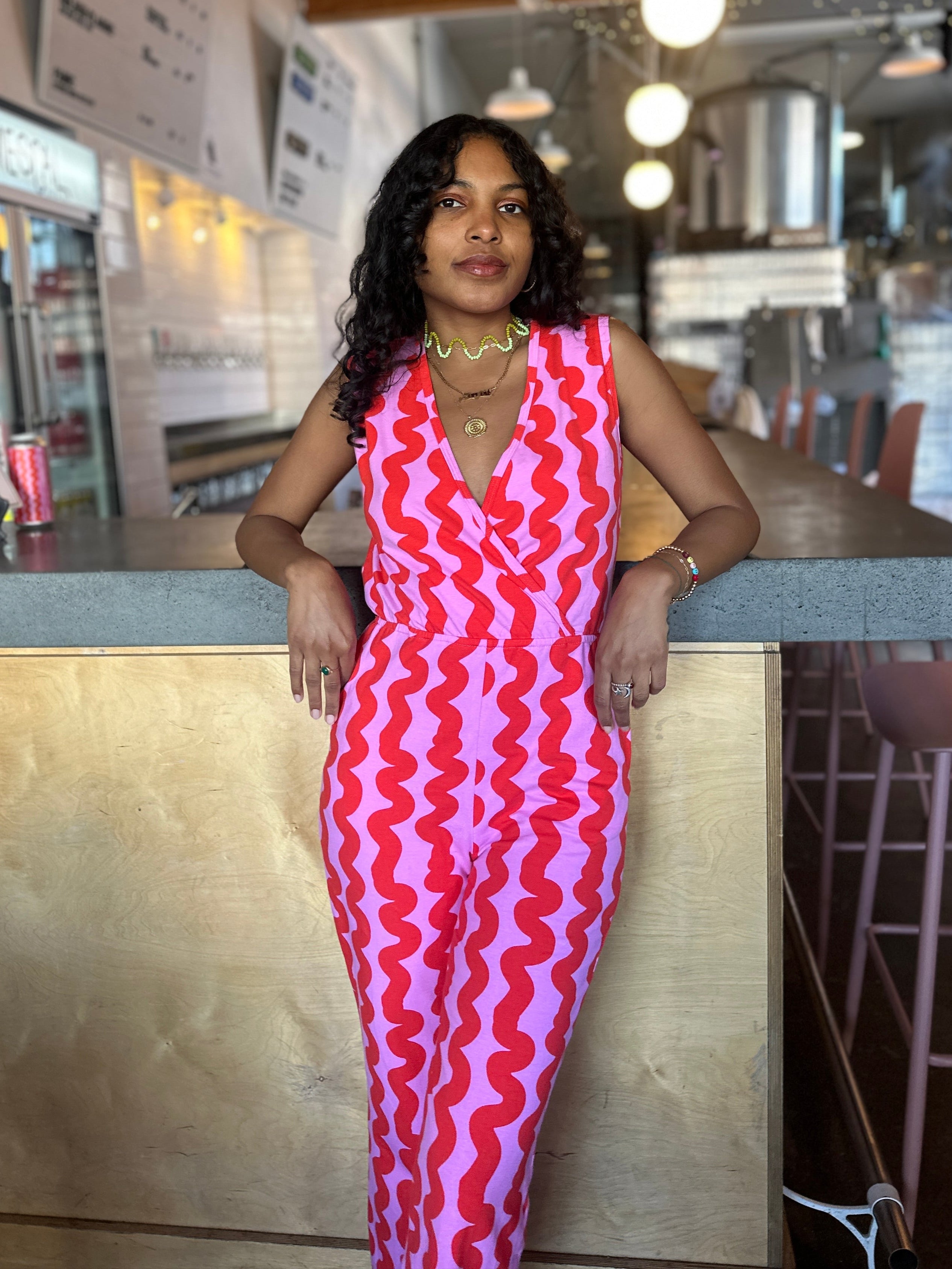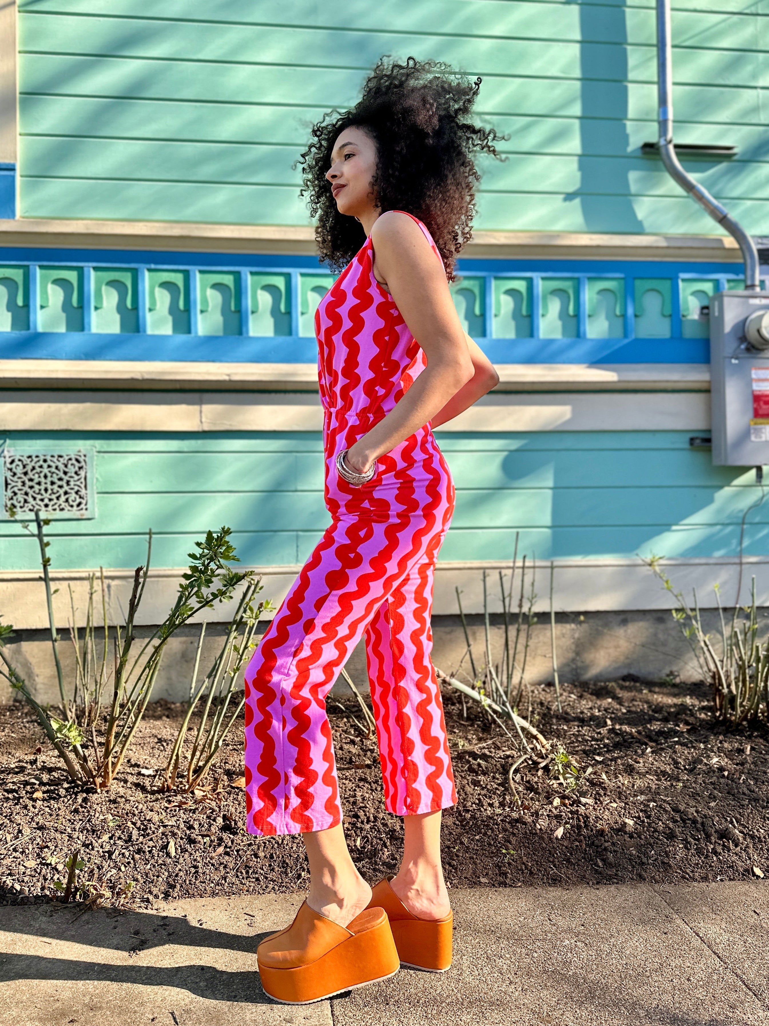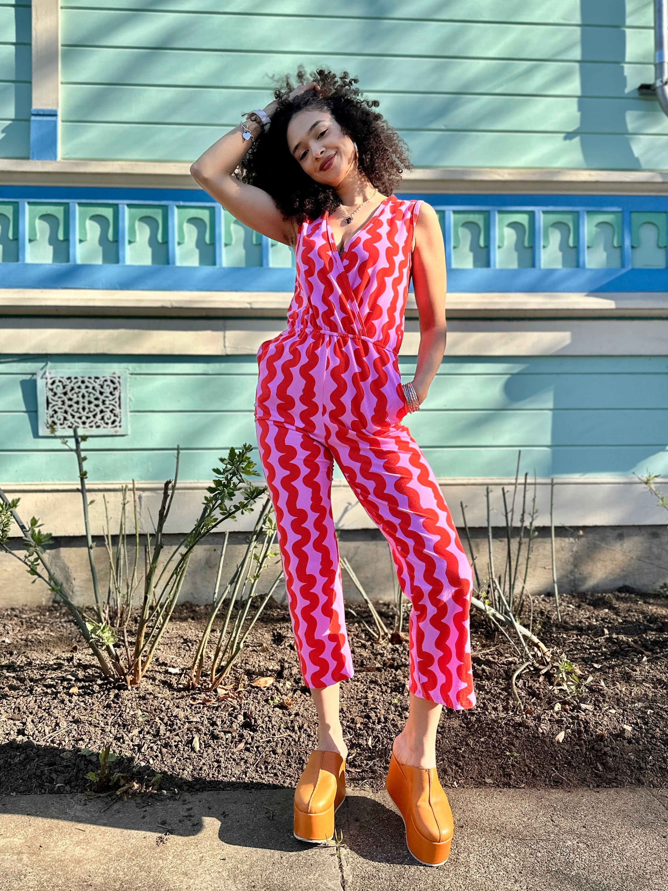 We measure each of our garments by hand laying flat. Our 10 oz stretch cotton jersey is incredibly soft and stretchy. It can stretch up to 8 additional inches on the body. This style also features an elastic waistband, so there’s a bit more sizing flexibility with this jumpsuit.