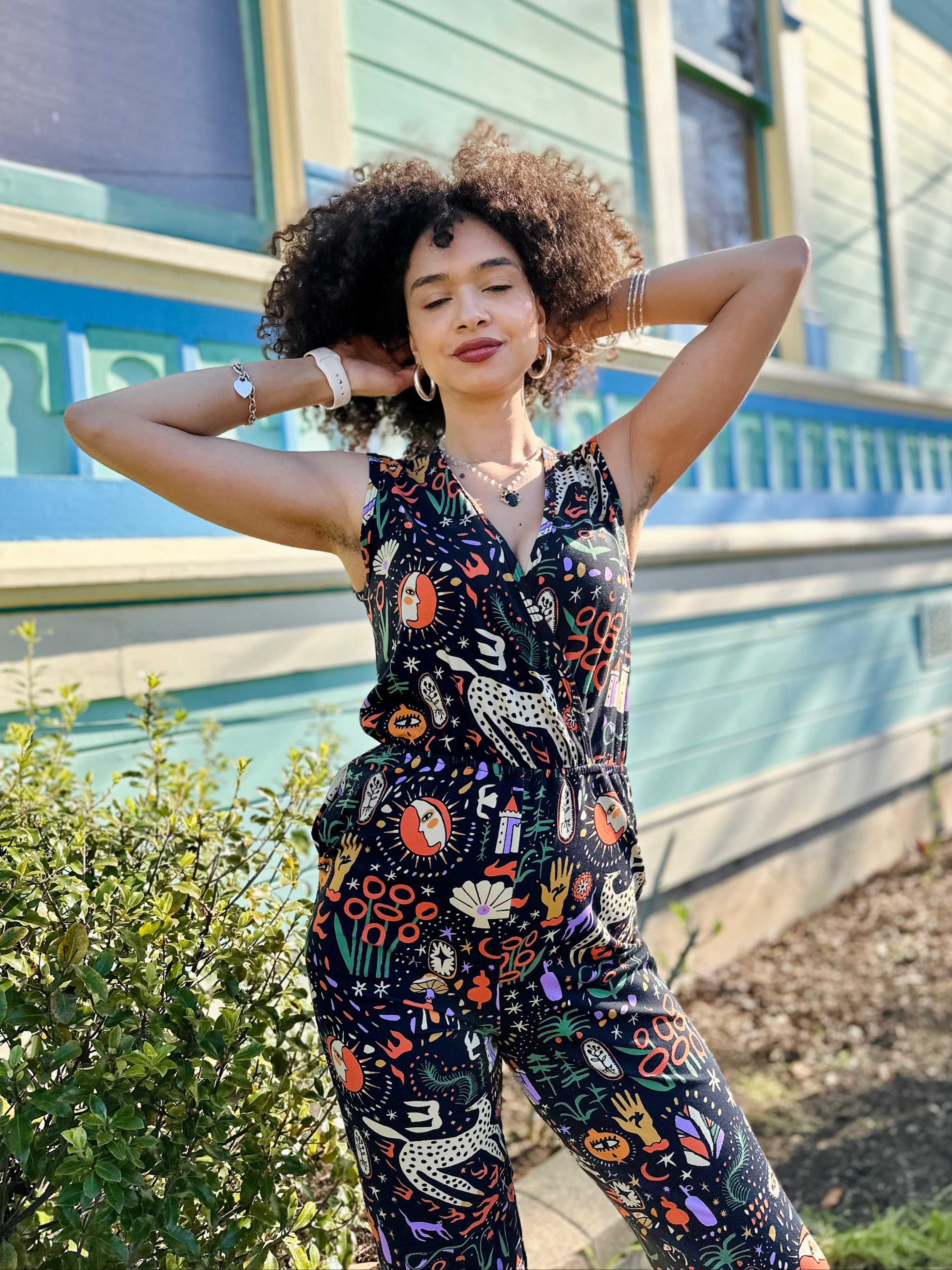 We measure each of our garments by hand laying flat. Our 10 oz stretch cotton jersey is incredibly soft and stretchy. It can stretch up to 8 additional inches on the body. This style also features an elastic waistband, so there’s a bit more sizing flexibility with this jumpsuit.