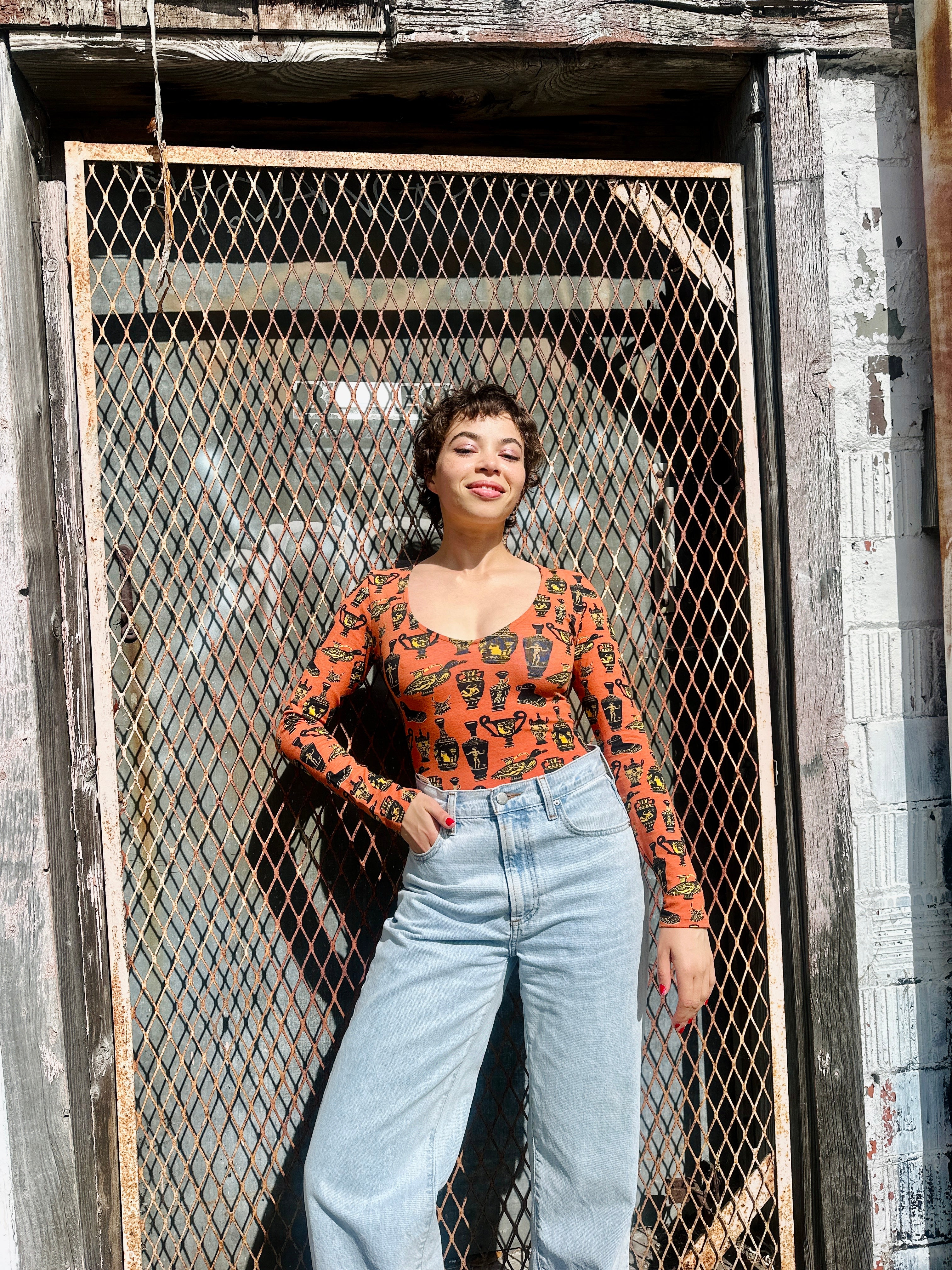 Our take on a classic wardrobe staple! The long sleeve bodysuit is the layering piece every closet needs, with the extra pizazz you expect from Nooworks. This bodysuit is made from our soft stretch jersey and features a deep V-neck, long sleeves, and full coverage bottom.
