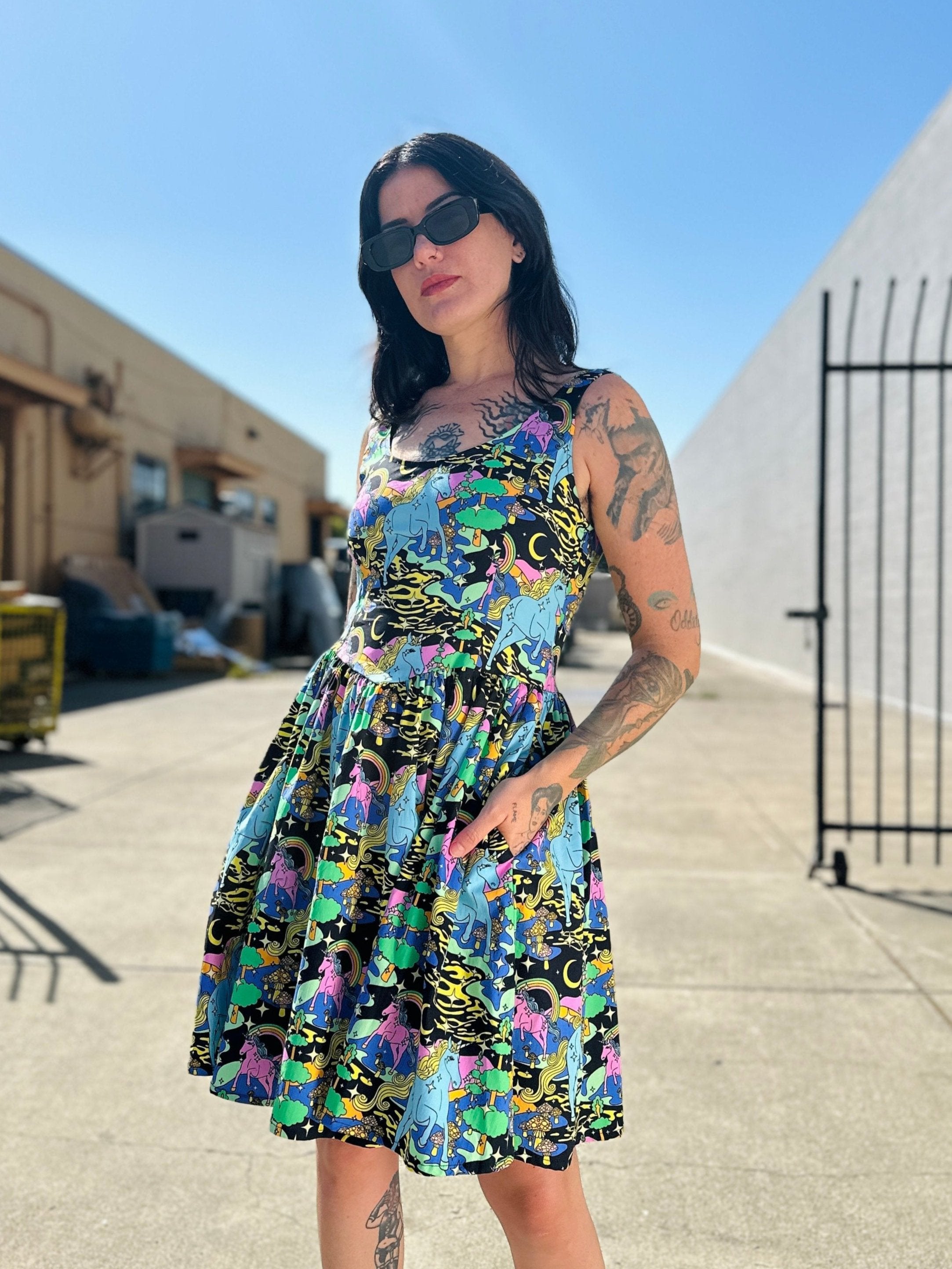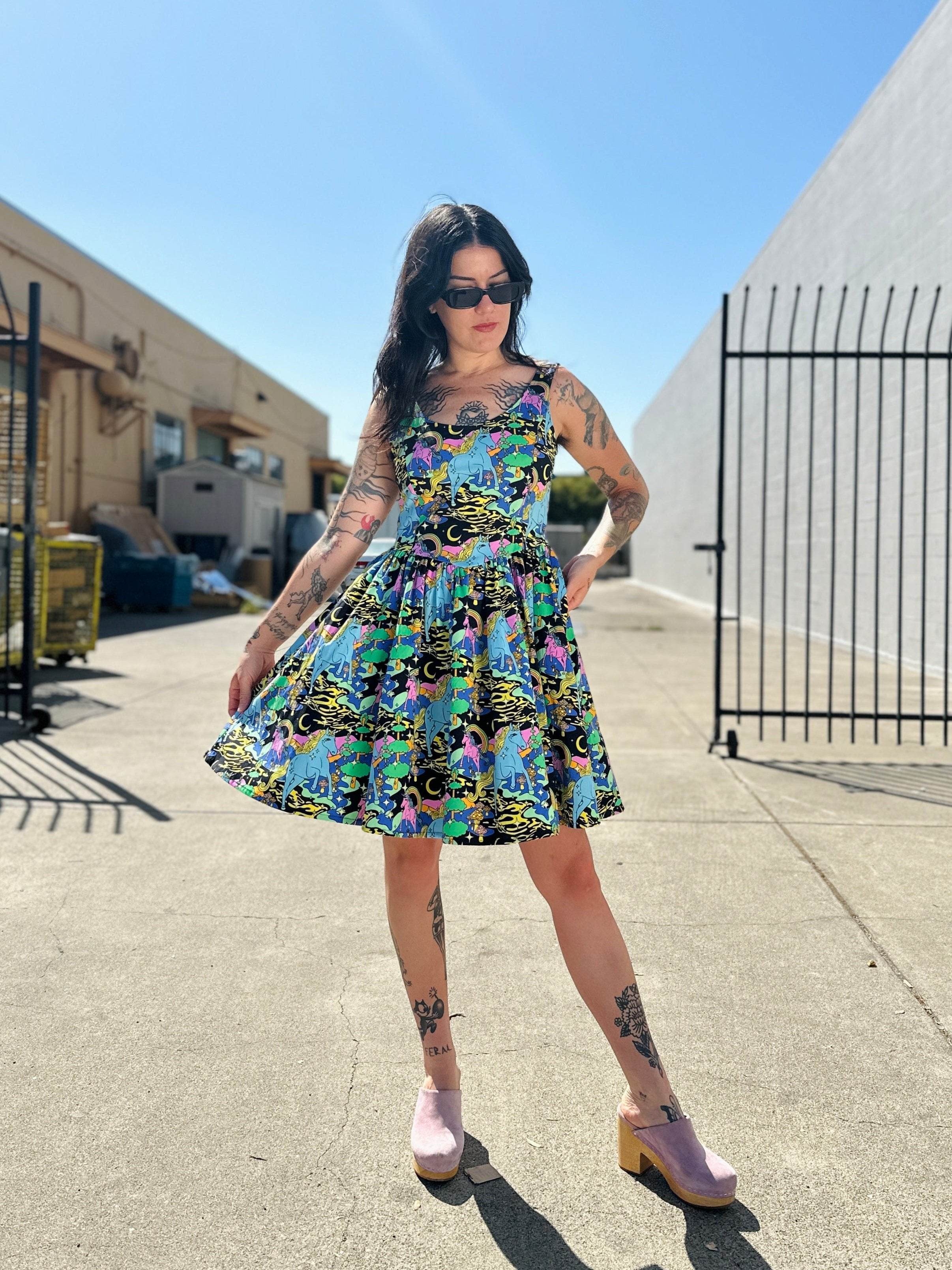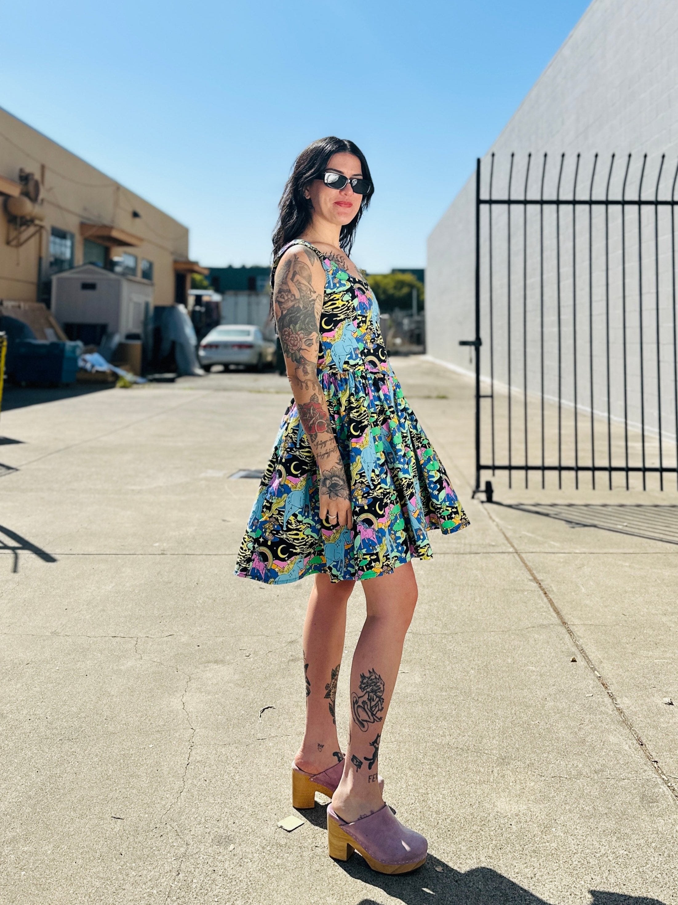 We are a woman owned, women run business. We make limited edition textiles with artists we love in cuts to make you look and feel good. All our garments are produced in California. We try to source all our materials in the USA and work with incredibly nice people.
