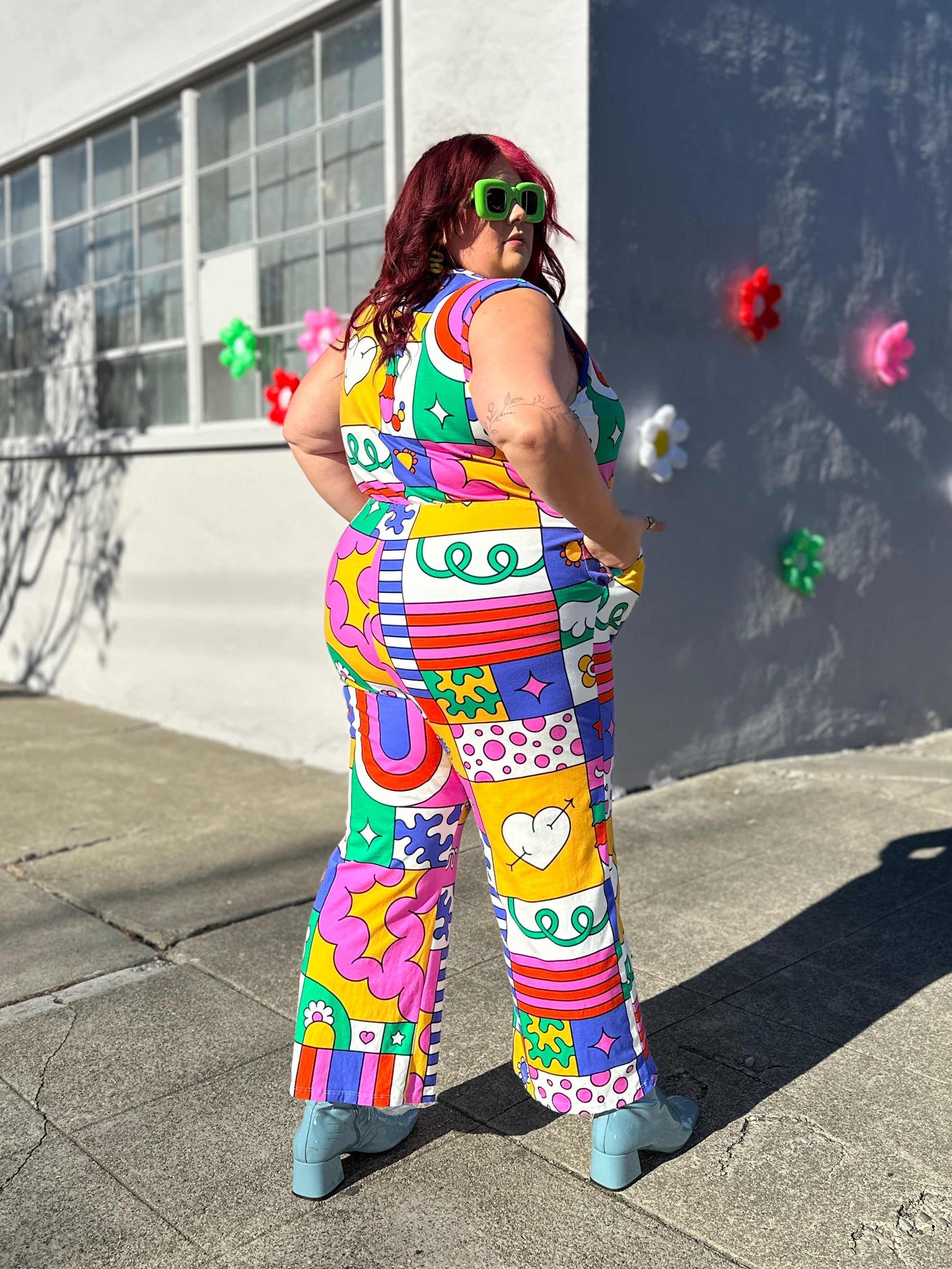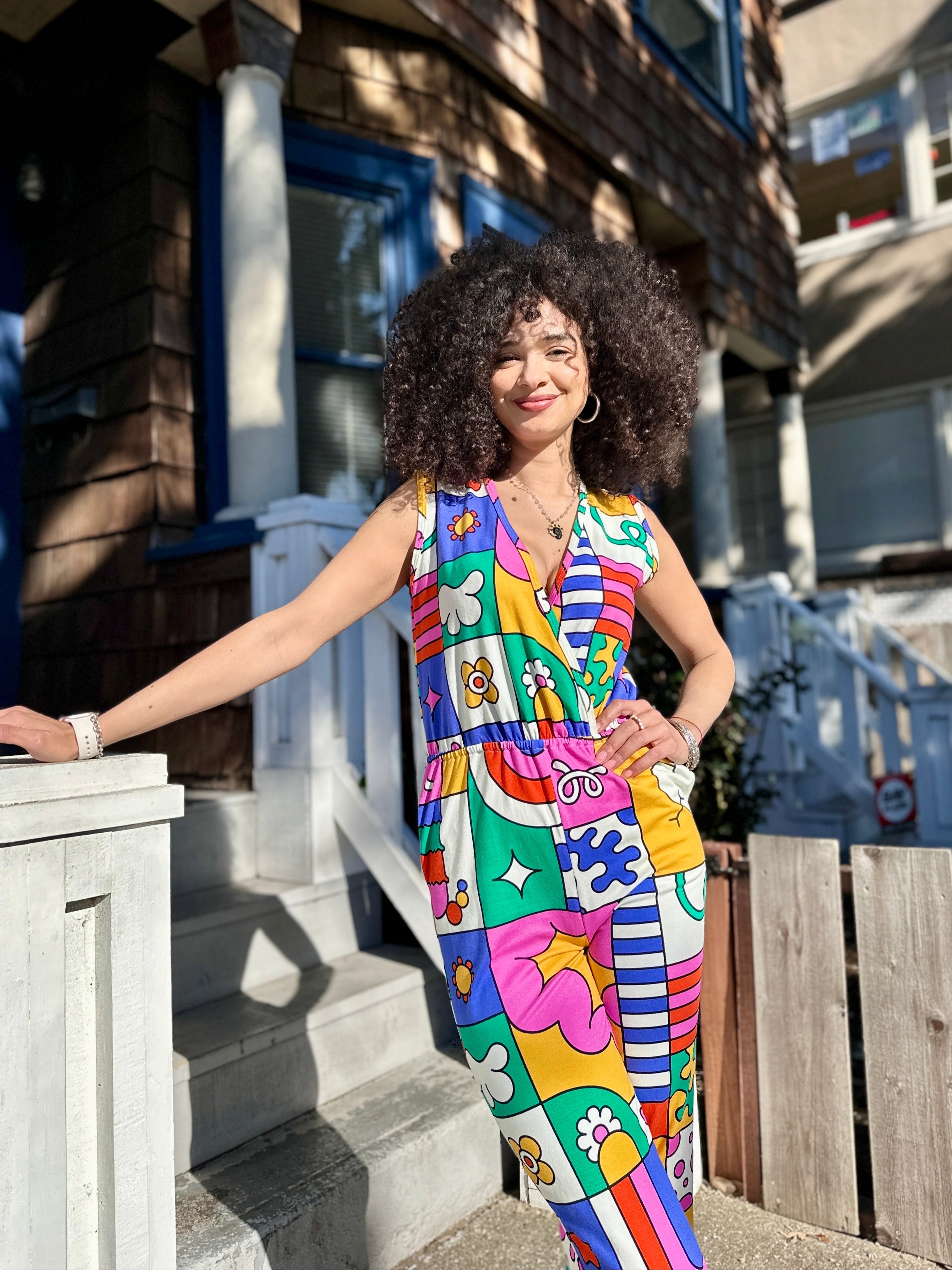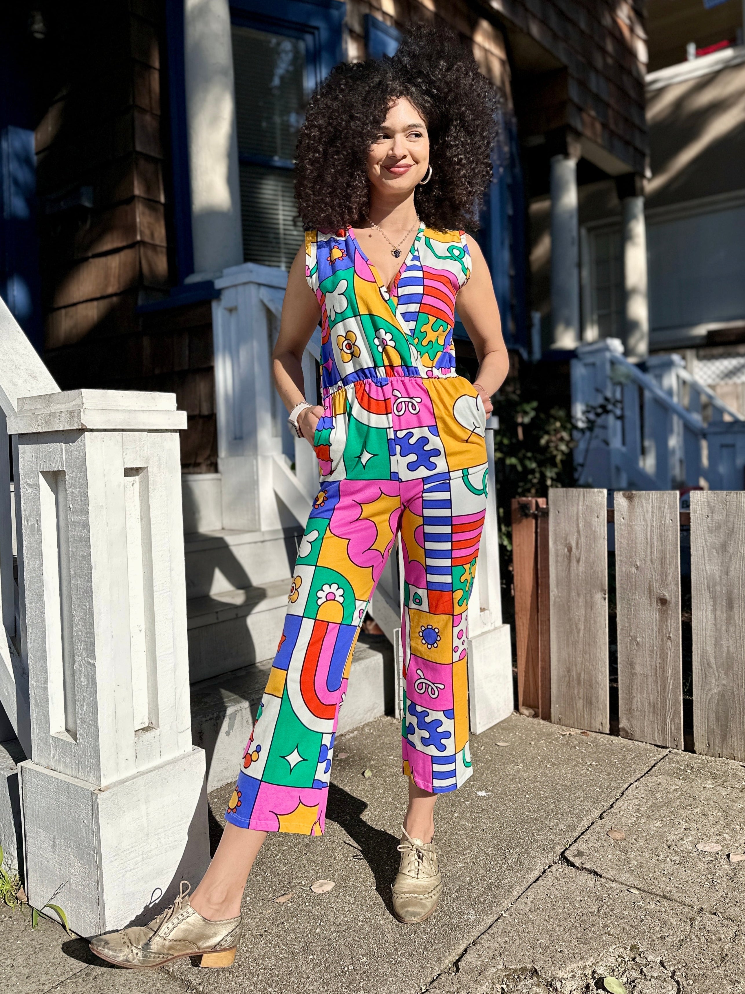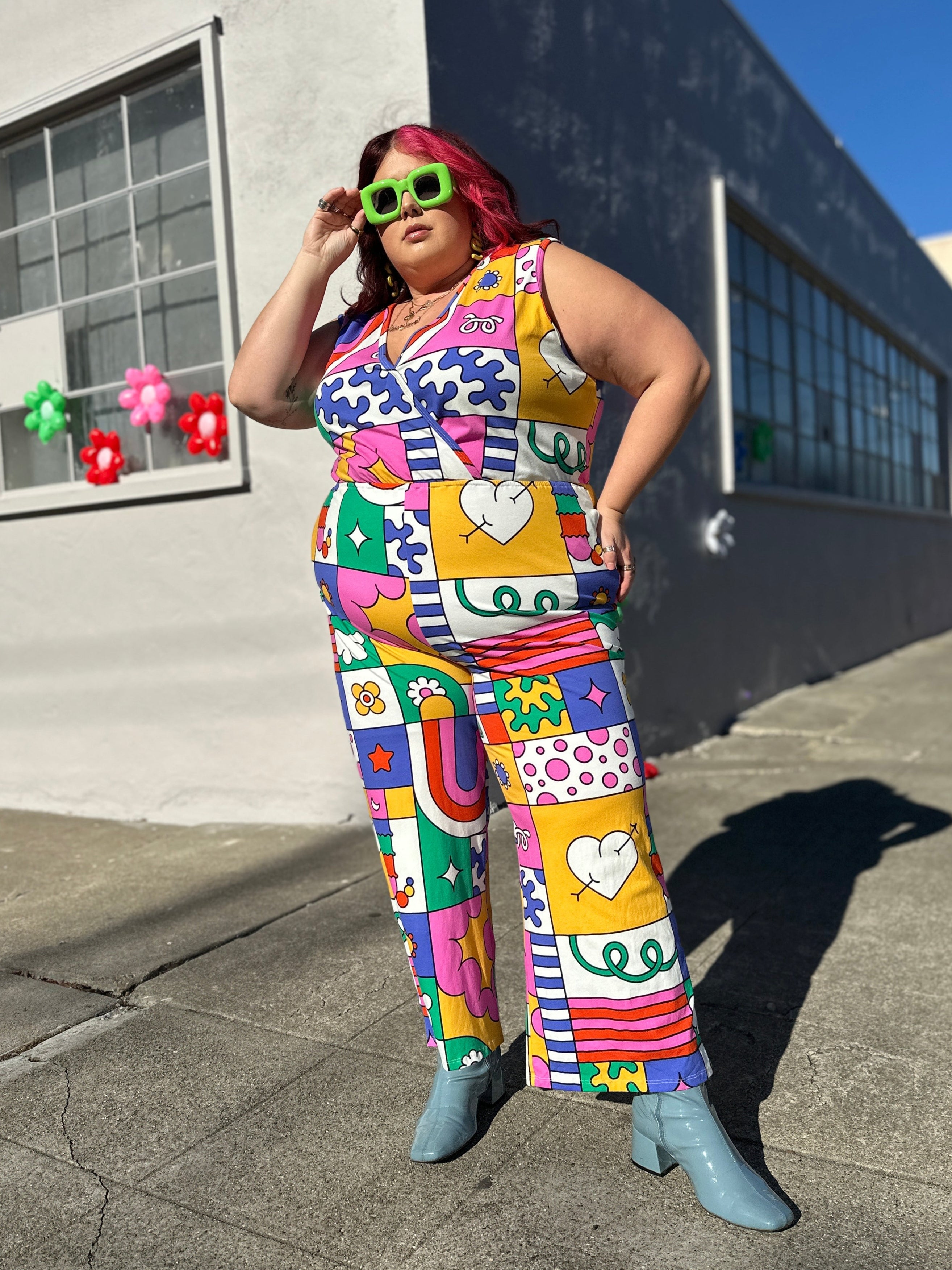 We measure each of our garments by hand laying flat. Our 10 oz stretch cotton jersey is incredibly soft and stretchy. It can stretch up to 8 additional inches on the body. This style also features an elastic waistband, so there’s a bit more sizing flexibility with this jumpsuit.