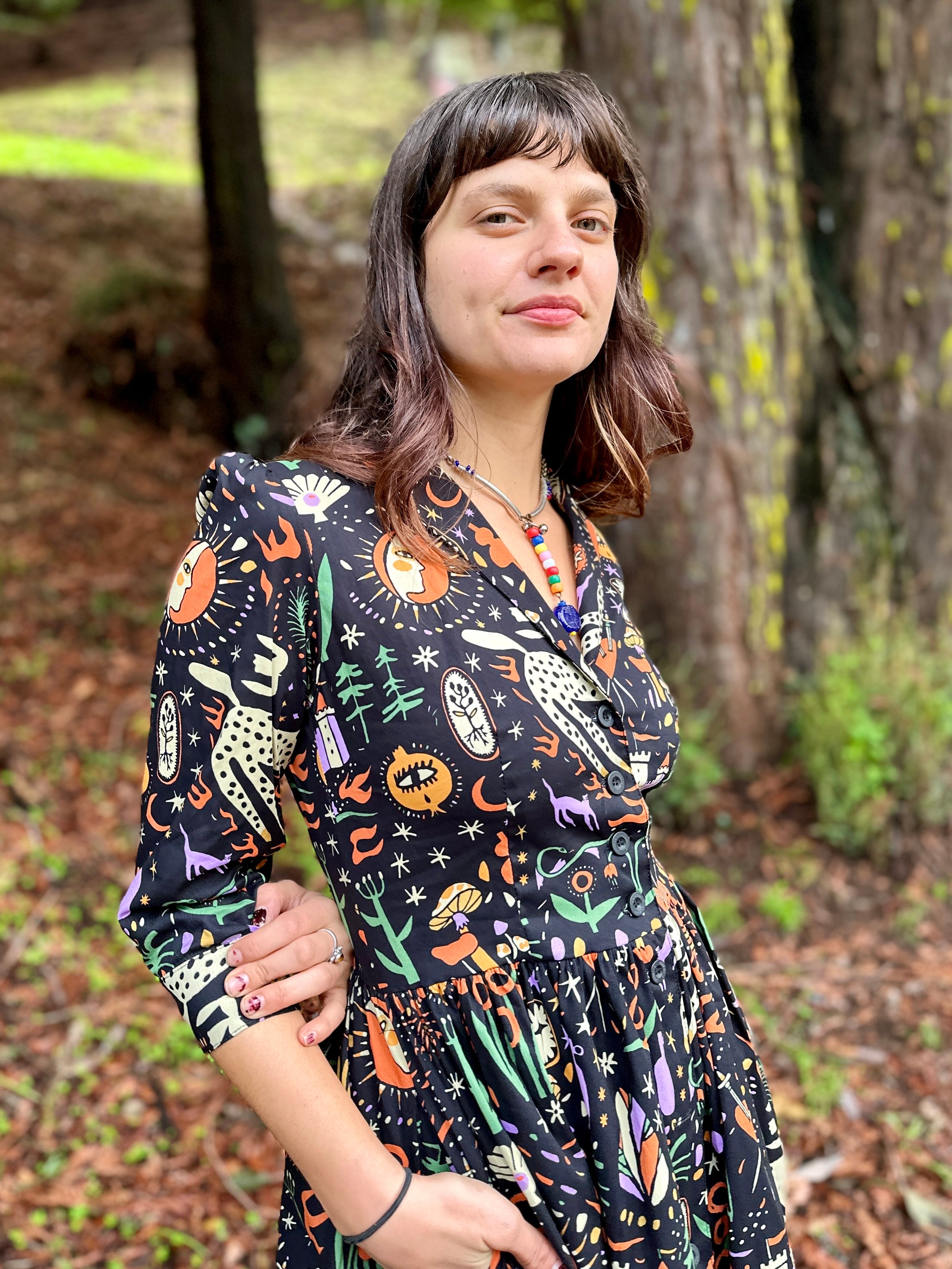We are a woman owned, women run business. We make limited edition textiles with artists we love in cuts to make you look and feel good. All our garments are produced in California. We try to source all our materials in the USA and work with incredibly nice people.