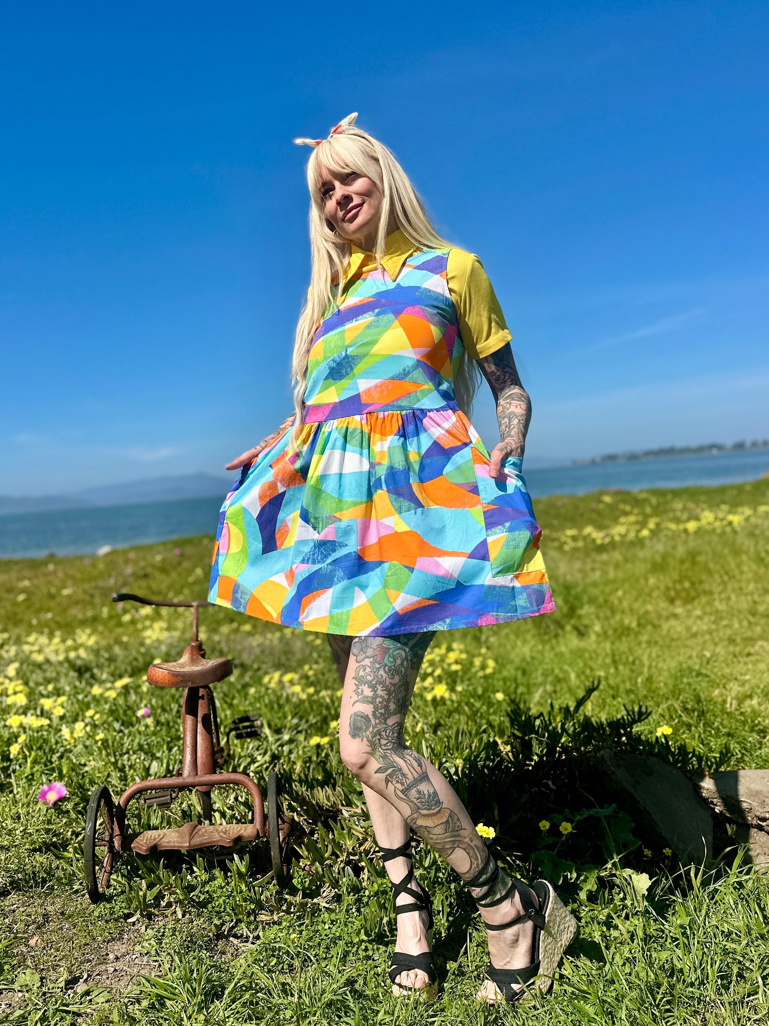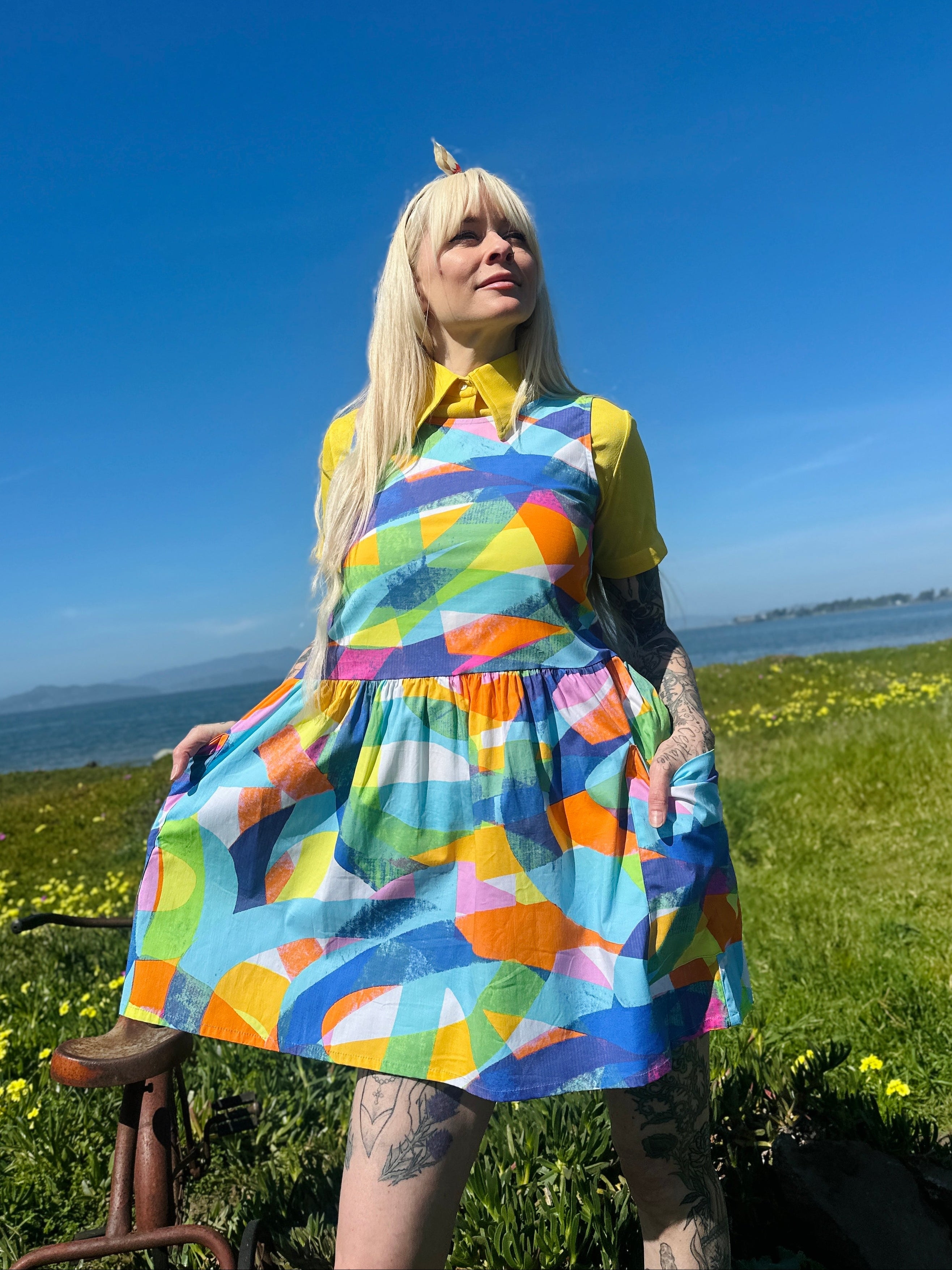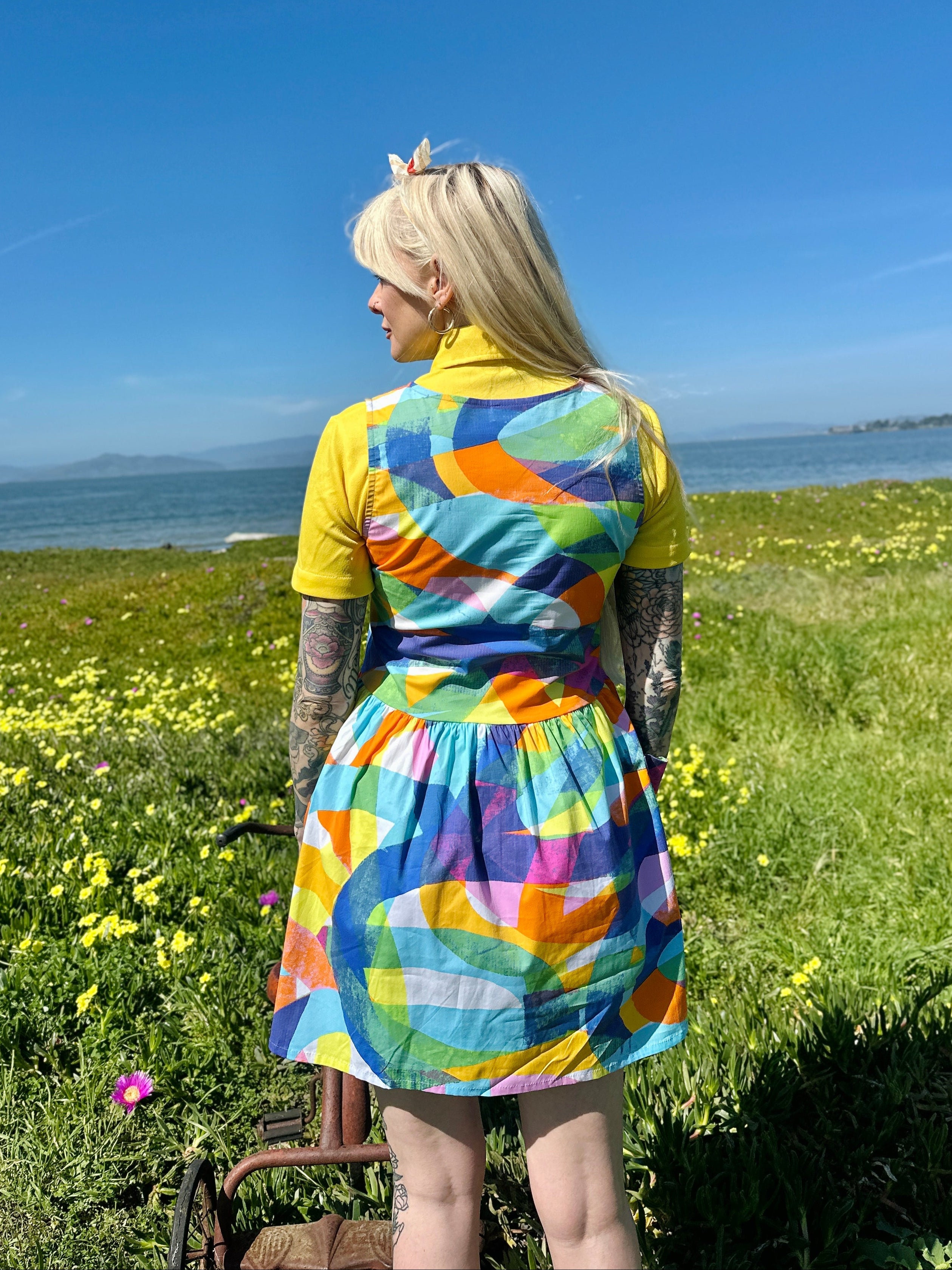 We are a woman owned, women run business. We make limited edition textiles with artists we love in cuts to make you look and feel good. All our garments are produced in California. We try to source all our materials in the USA and work with incredibly nice people.