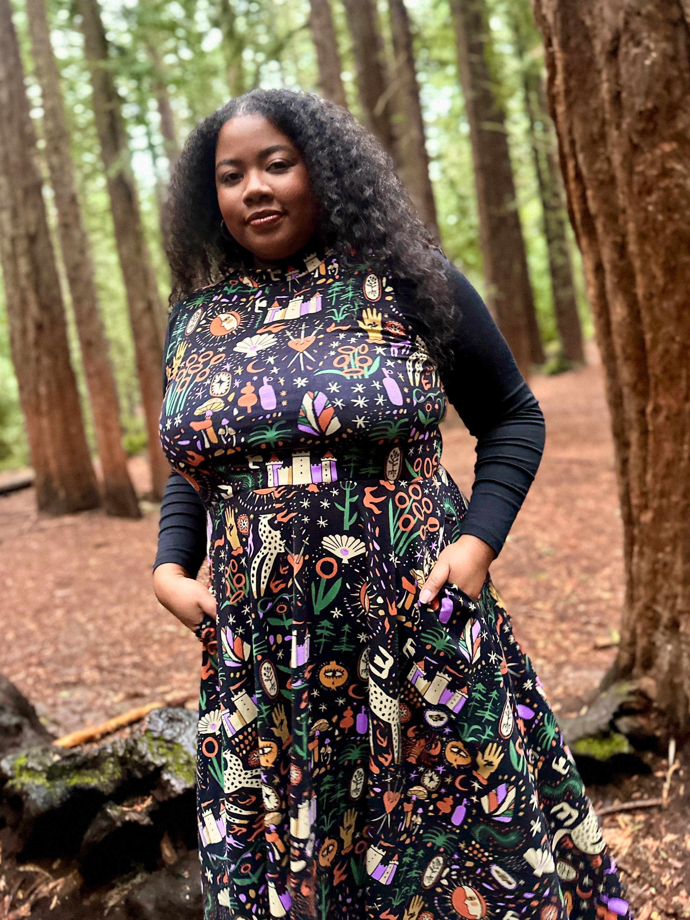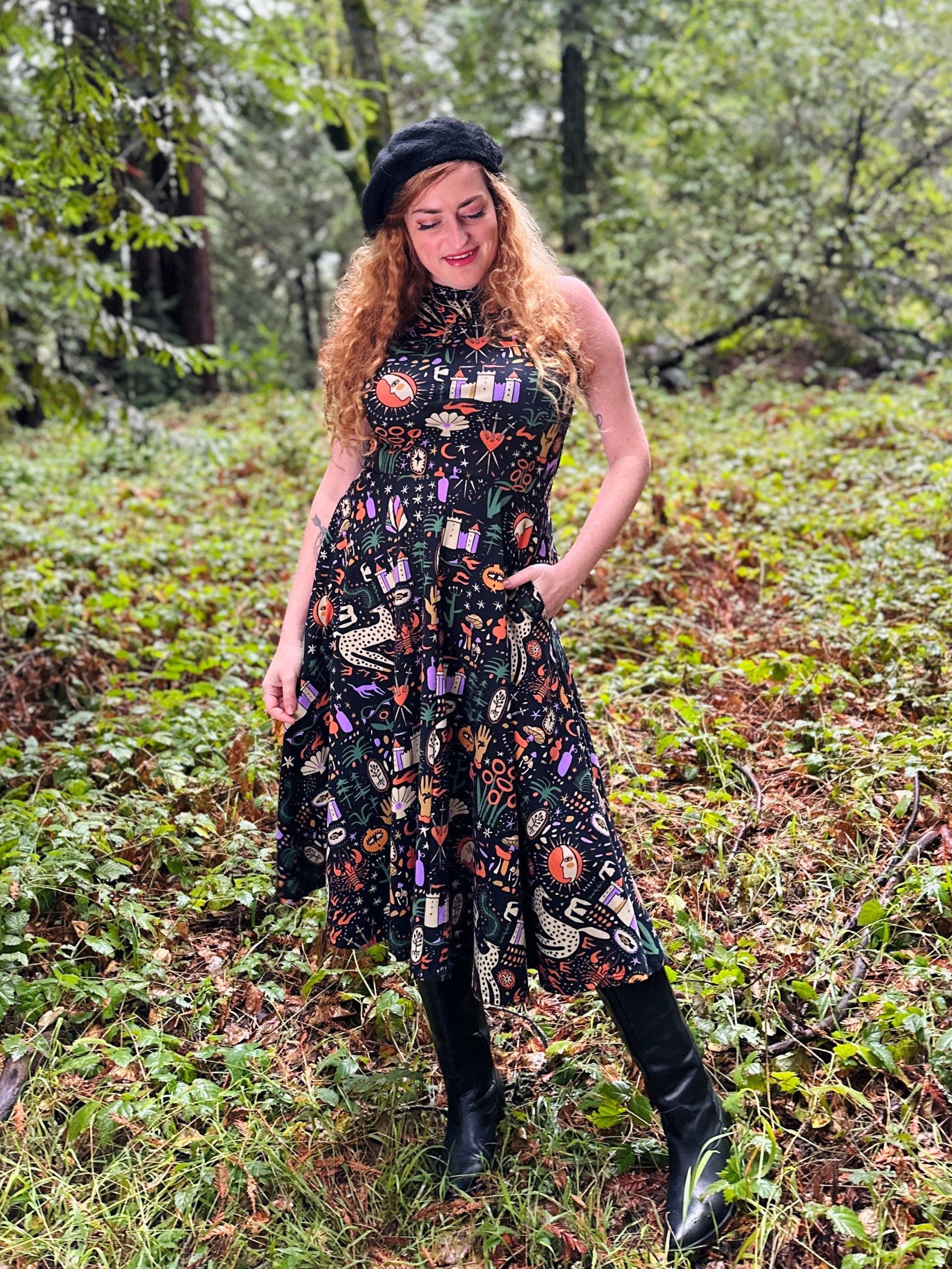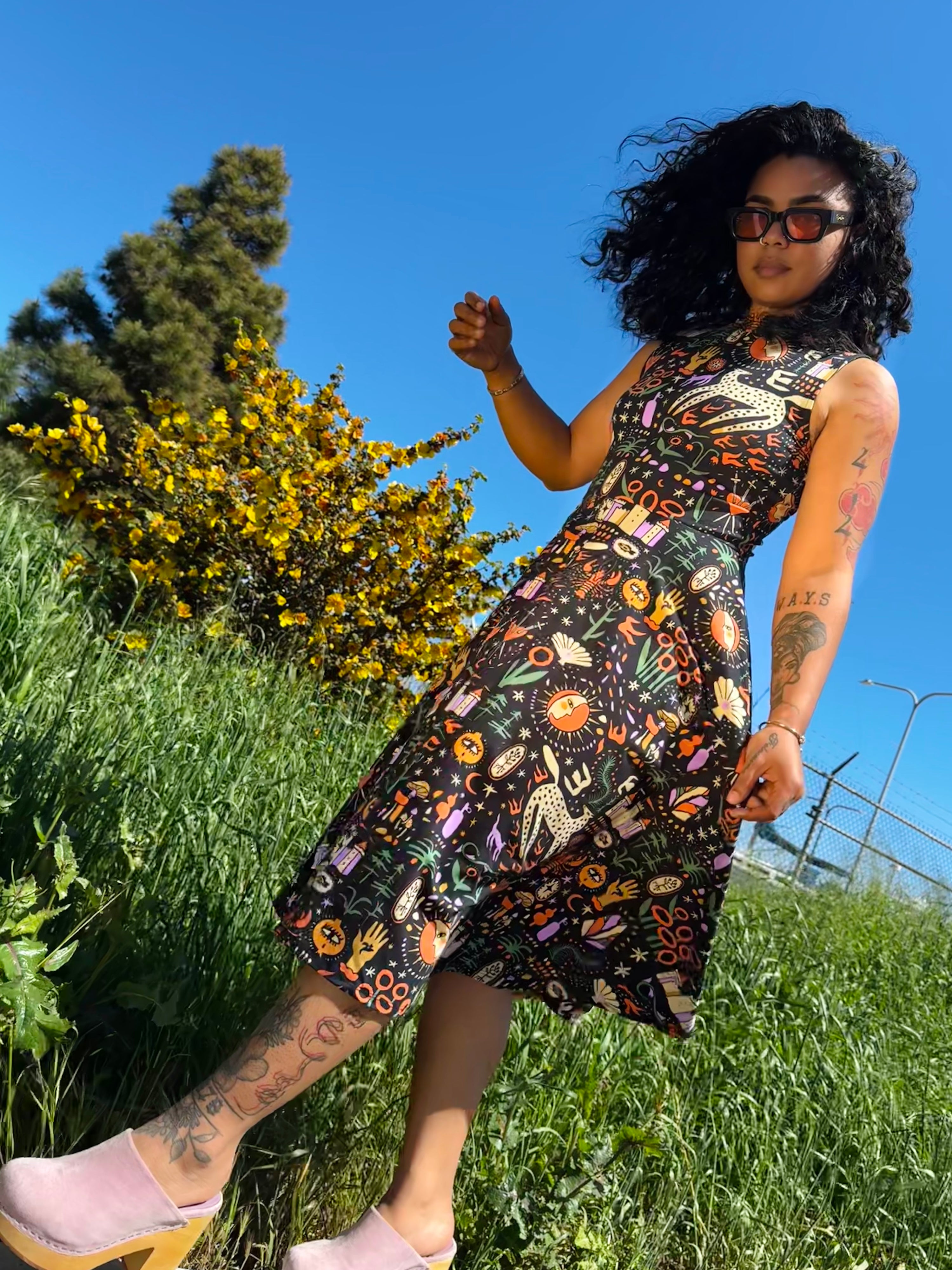 We took your favorite vacation dress and made it a little fancier. Mock neck, fitted bodice, full skirt and hidden pockets.+ Featuring the artwork of...