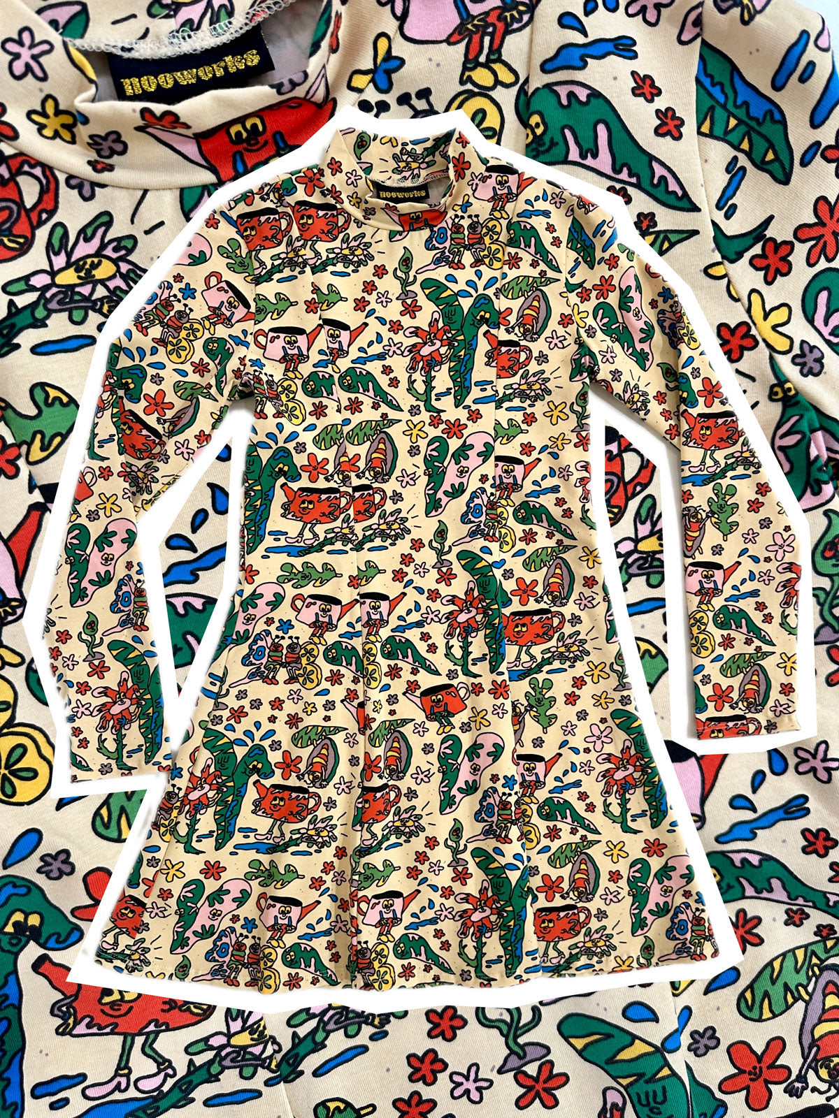 We are a woman owned, women run business. We make limited edition textiles with artists we love in cuts to make you look and feel good. All our garments are produced in California. We try to source all our materials in the USA and work with incredibly nice people.