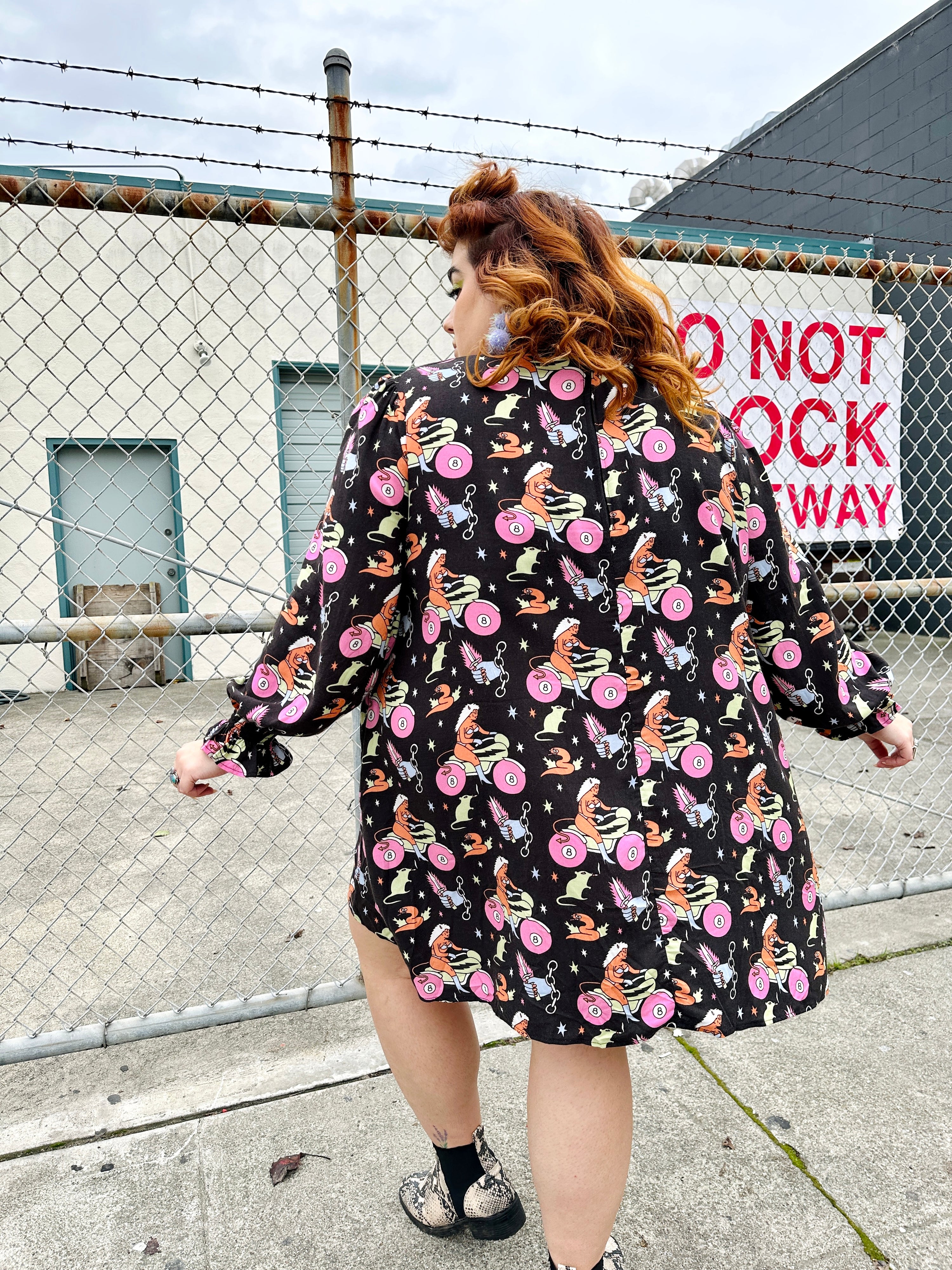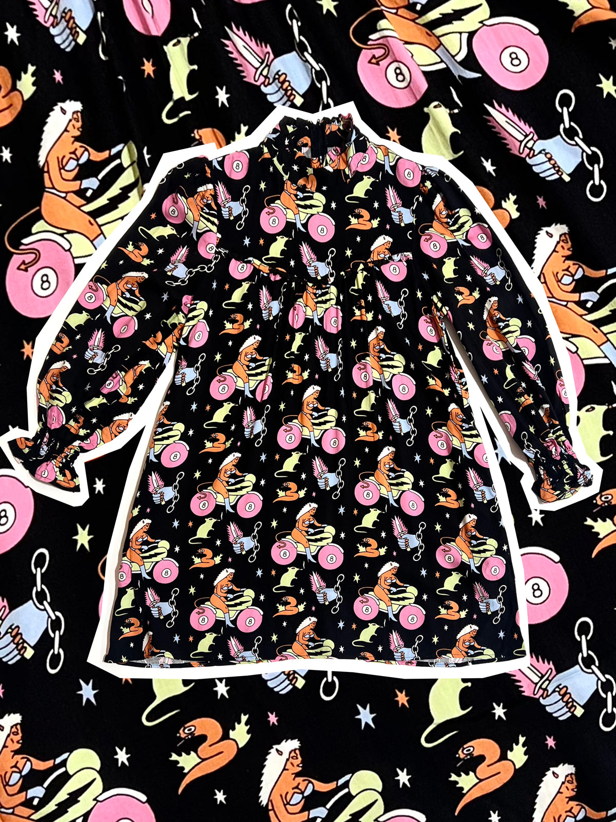 We are a woman owned, women run business. We make limited edition textiles with artists we love in cuts to make you look and feel good. All our garments are produced in California. We try to source all our materials in the USA and work with incredibly nice people.