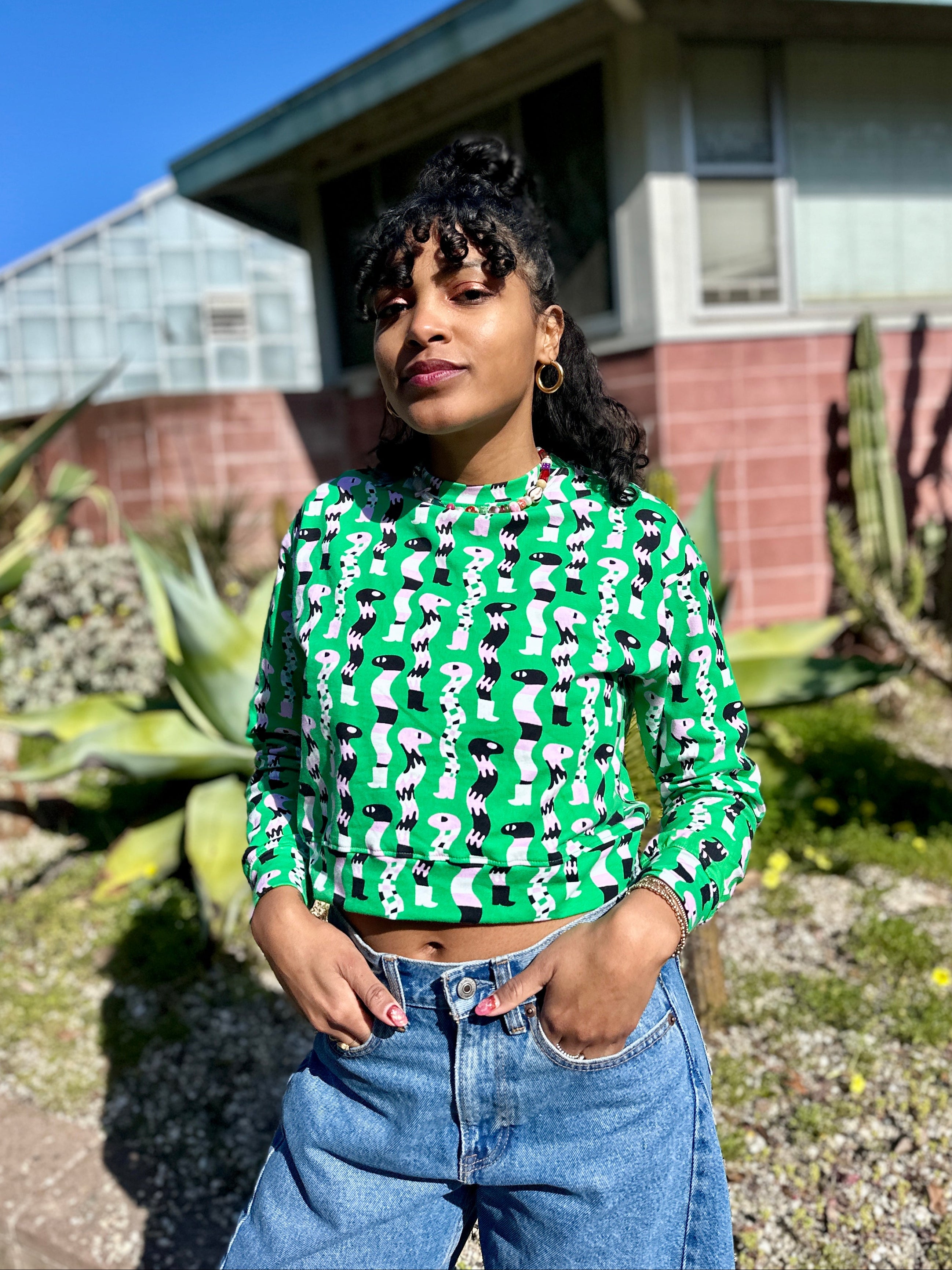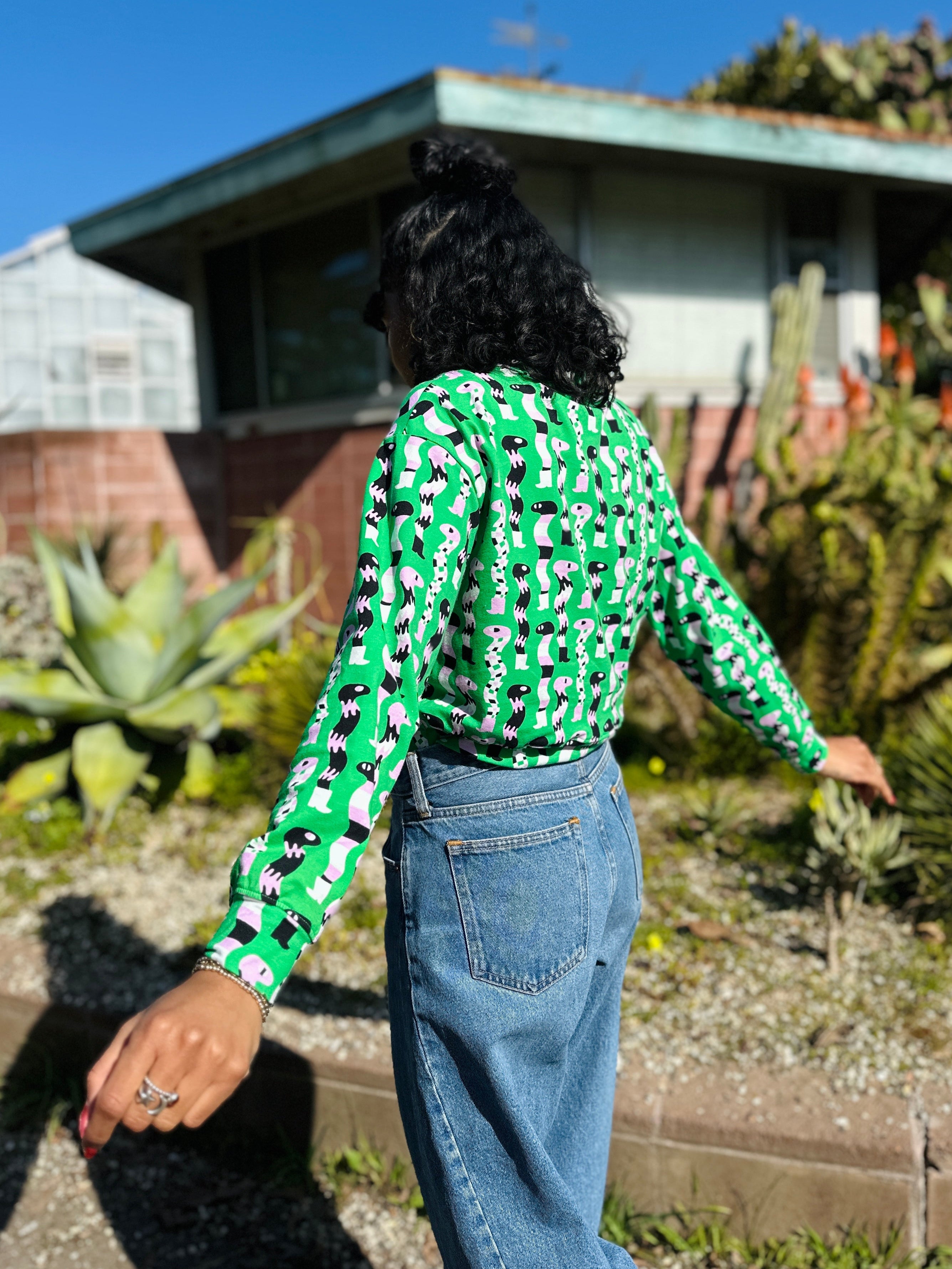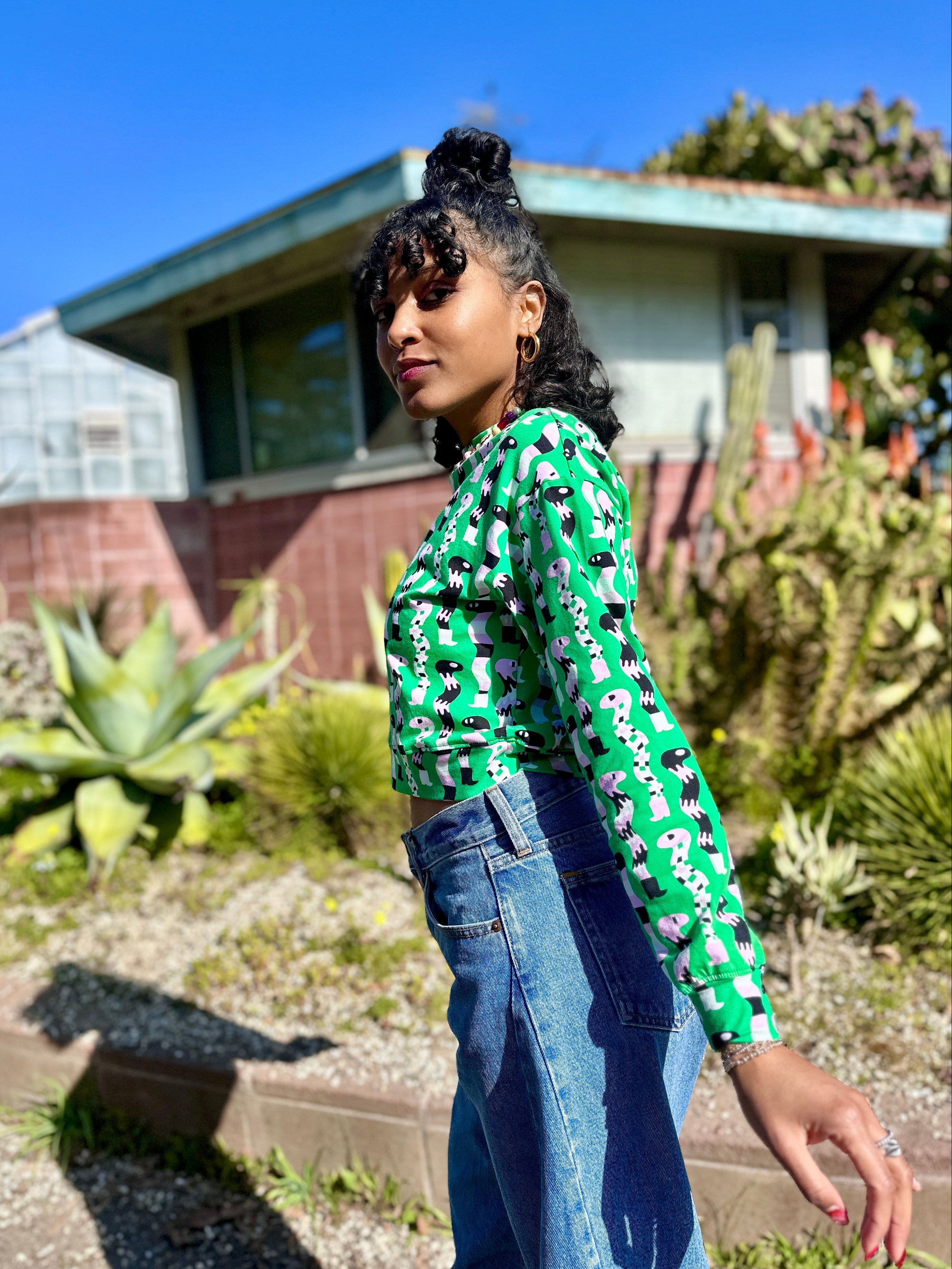 We are a woman owned, women run business. We make limited edition textiles with artists we love in cuts to make you look and feel good. All our garments are produced in California. We try to source all our materials in the USA and work with incredibly nice people.