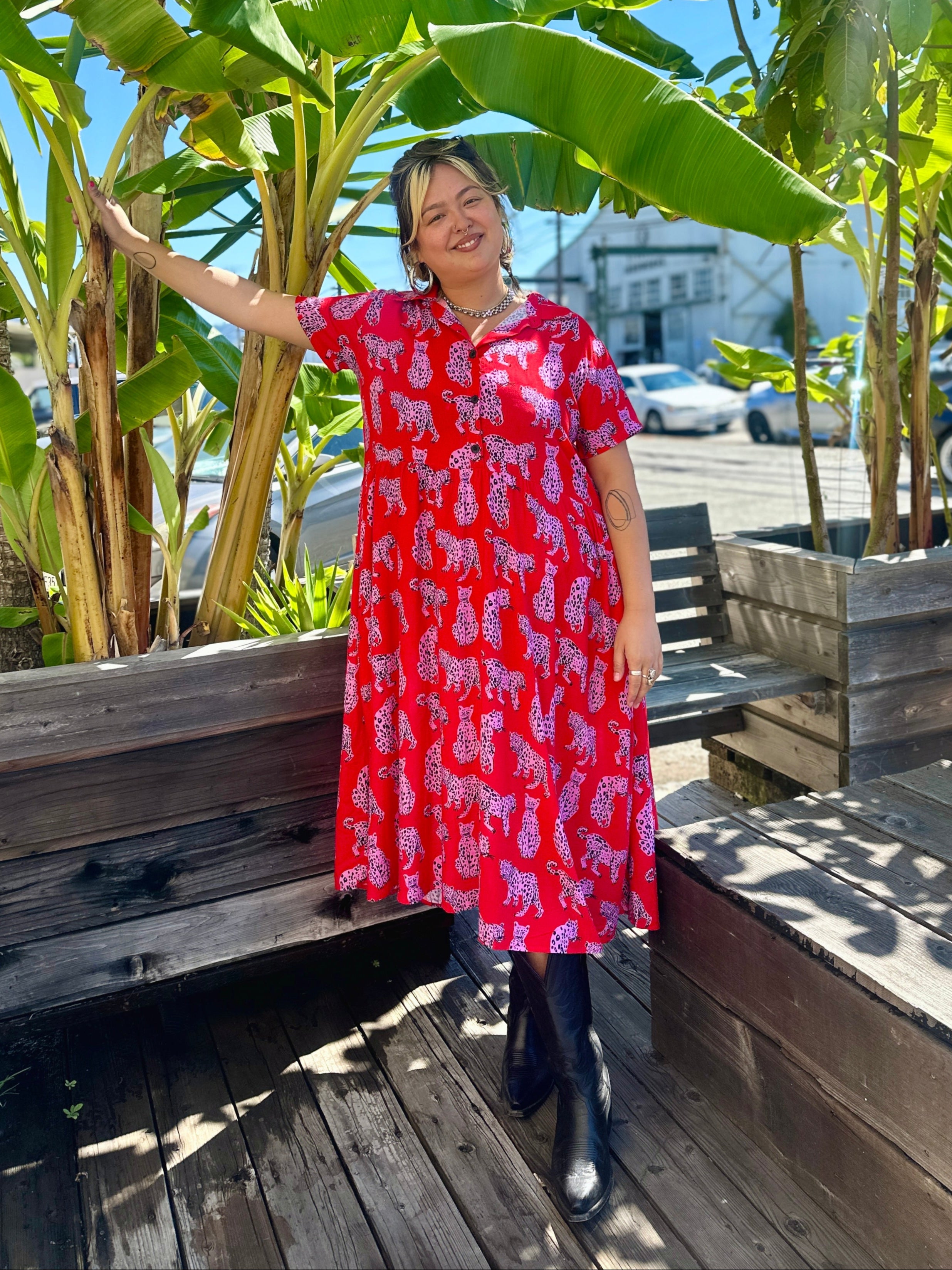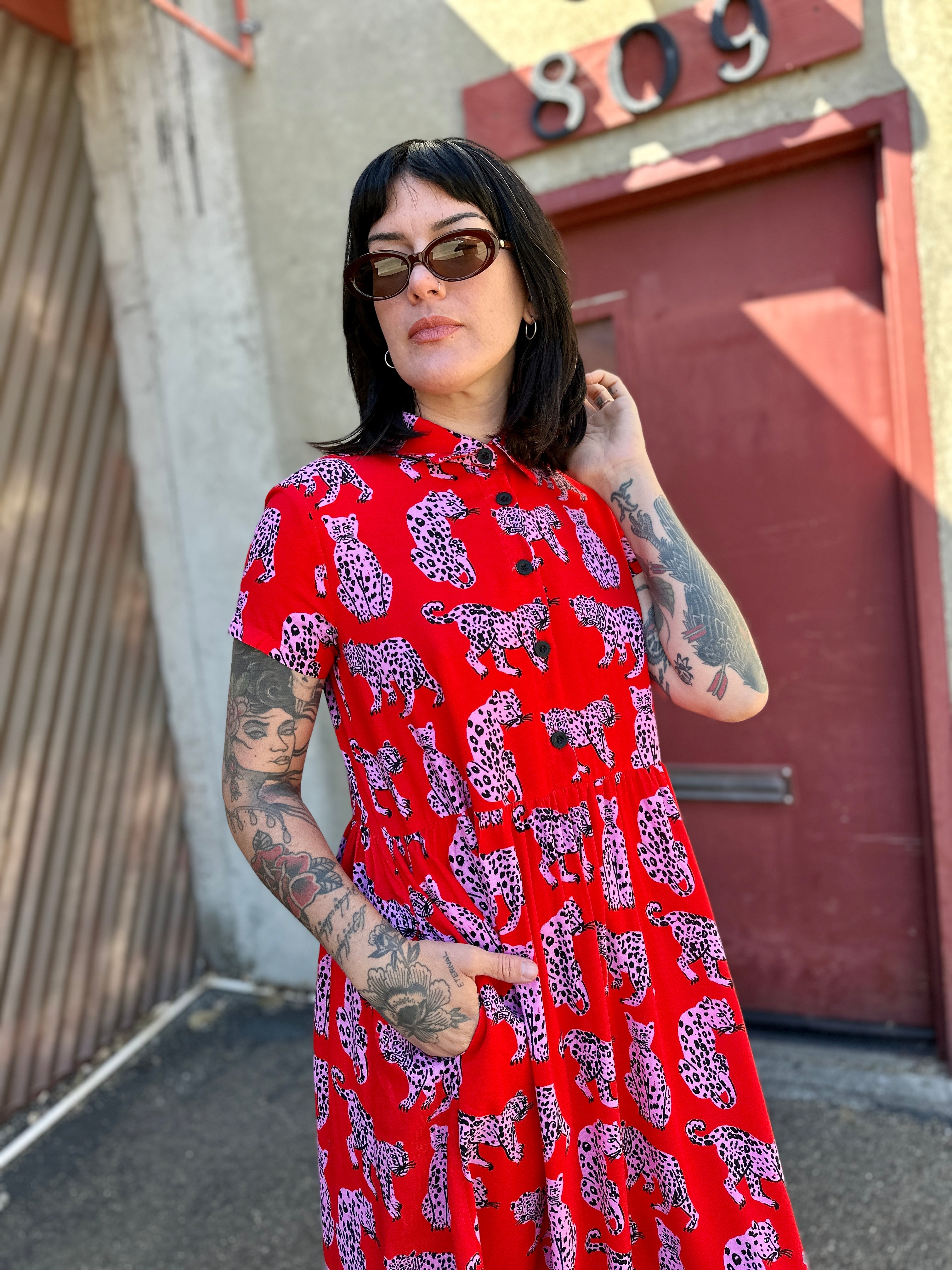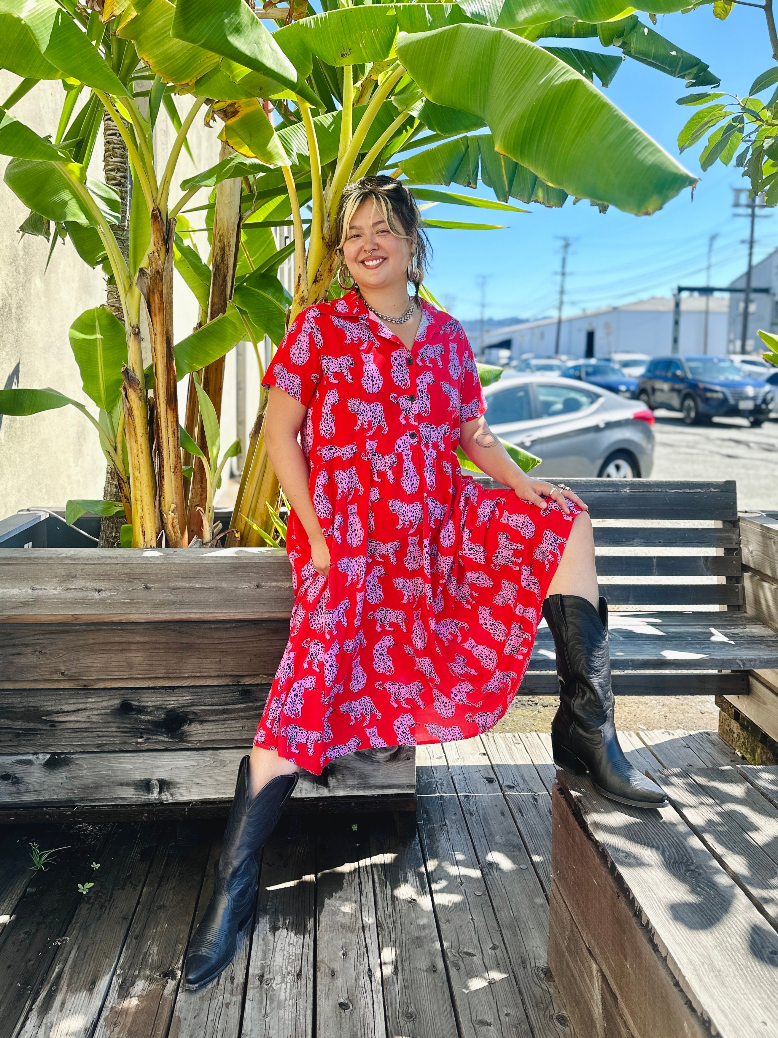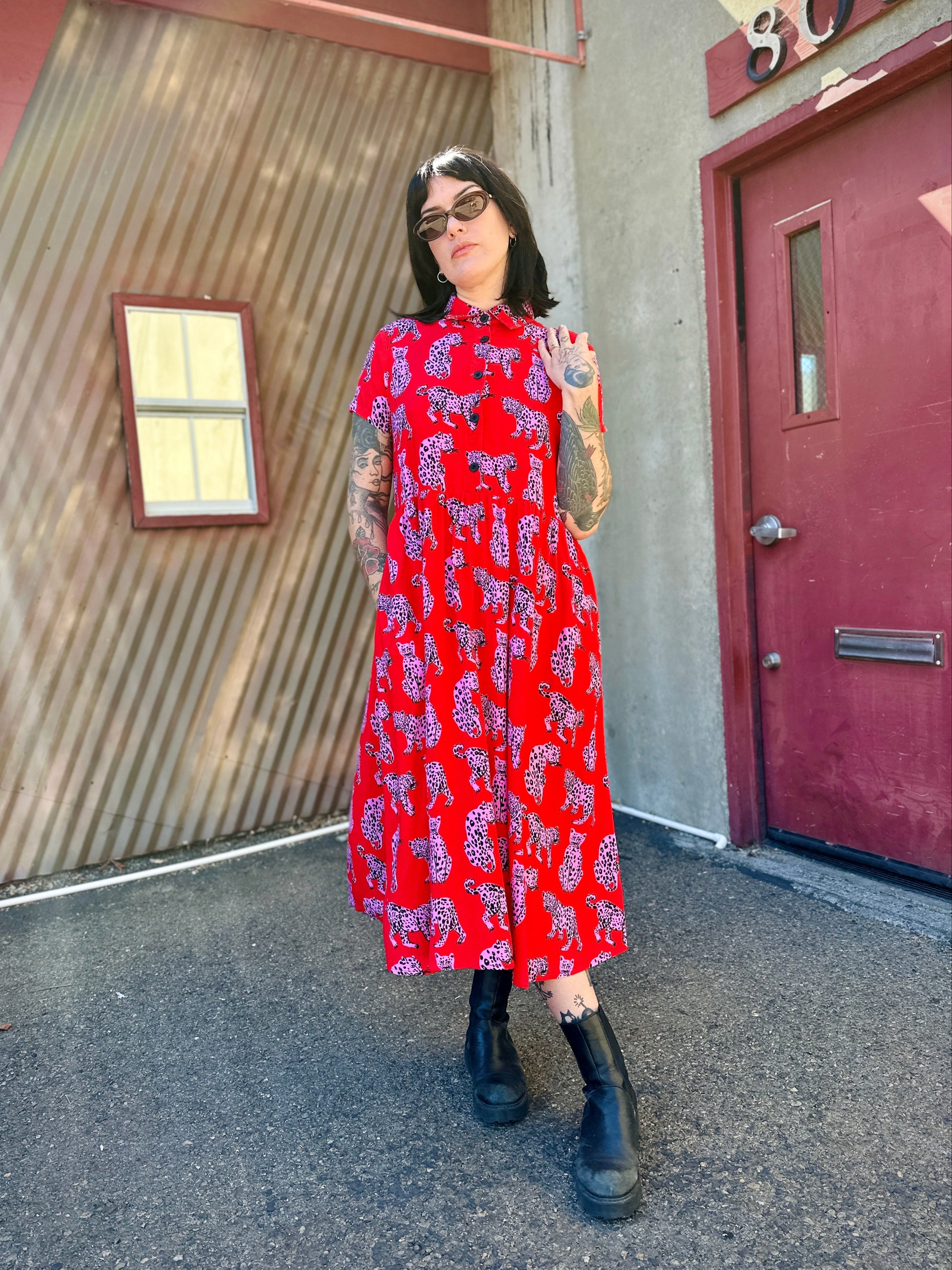 Woah baby! Your new favorite dress is here, it combines two Nooworks staples; the Naomi dress and Joyce top. This midi-length dress is cut from our super soft rayon and features a classic pointed collar and short-sleeves, buttons up the top half of the dress, and a loose and flowy drop-waist skirt. Wear it out to the farmers market for an easy breezy moment or layer it under a track top with popped collar for a seasonal change.