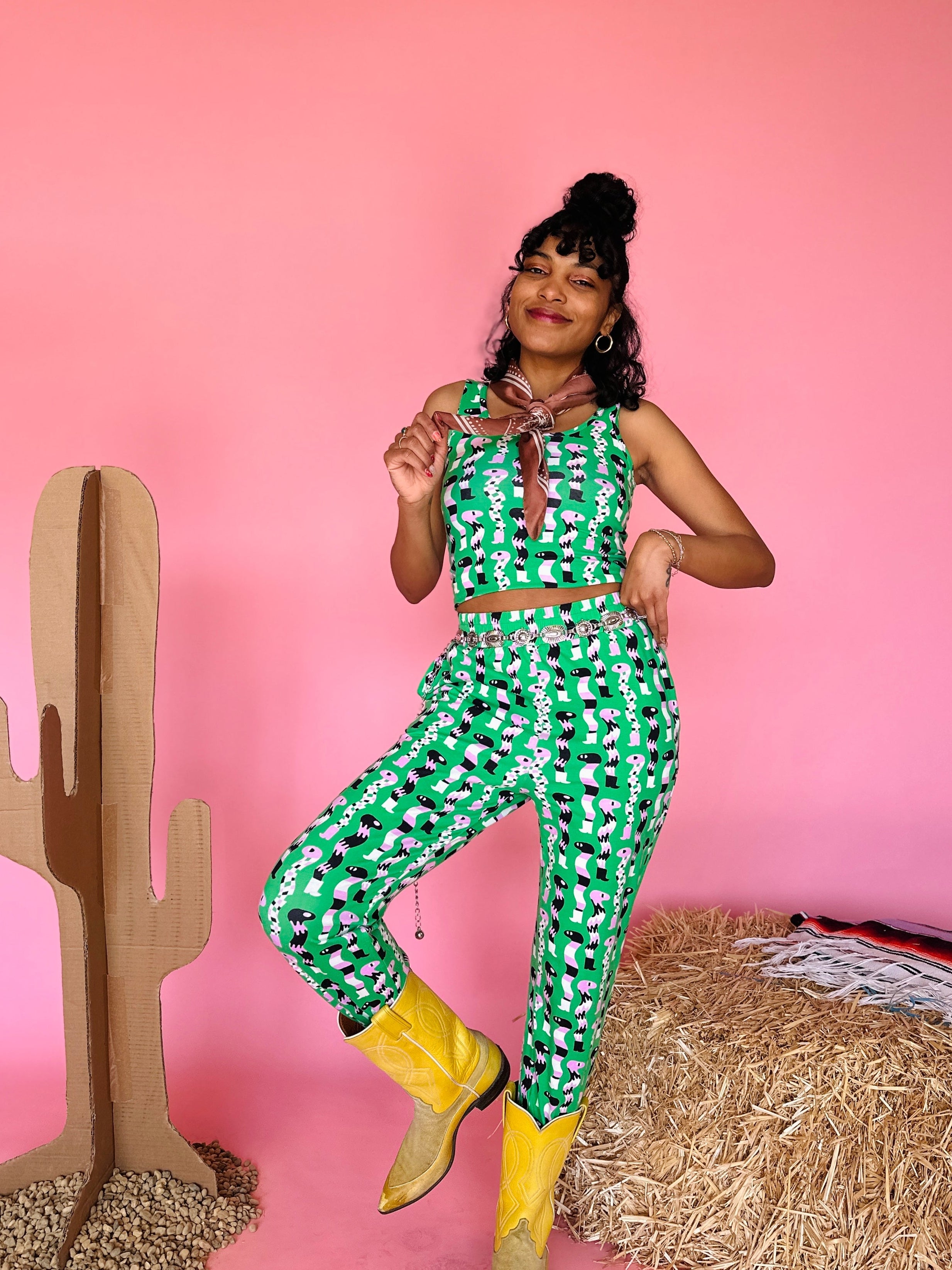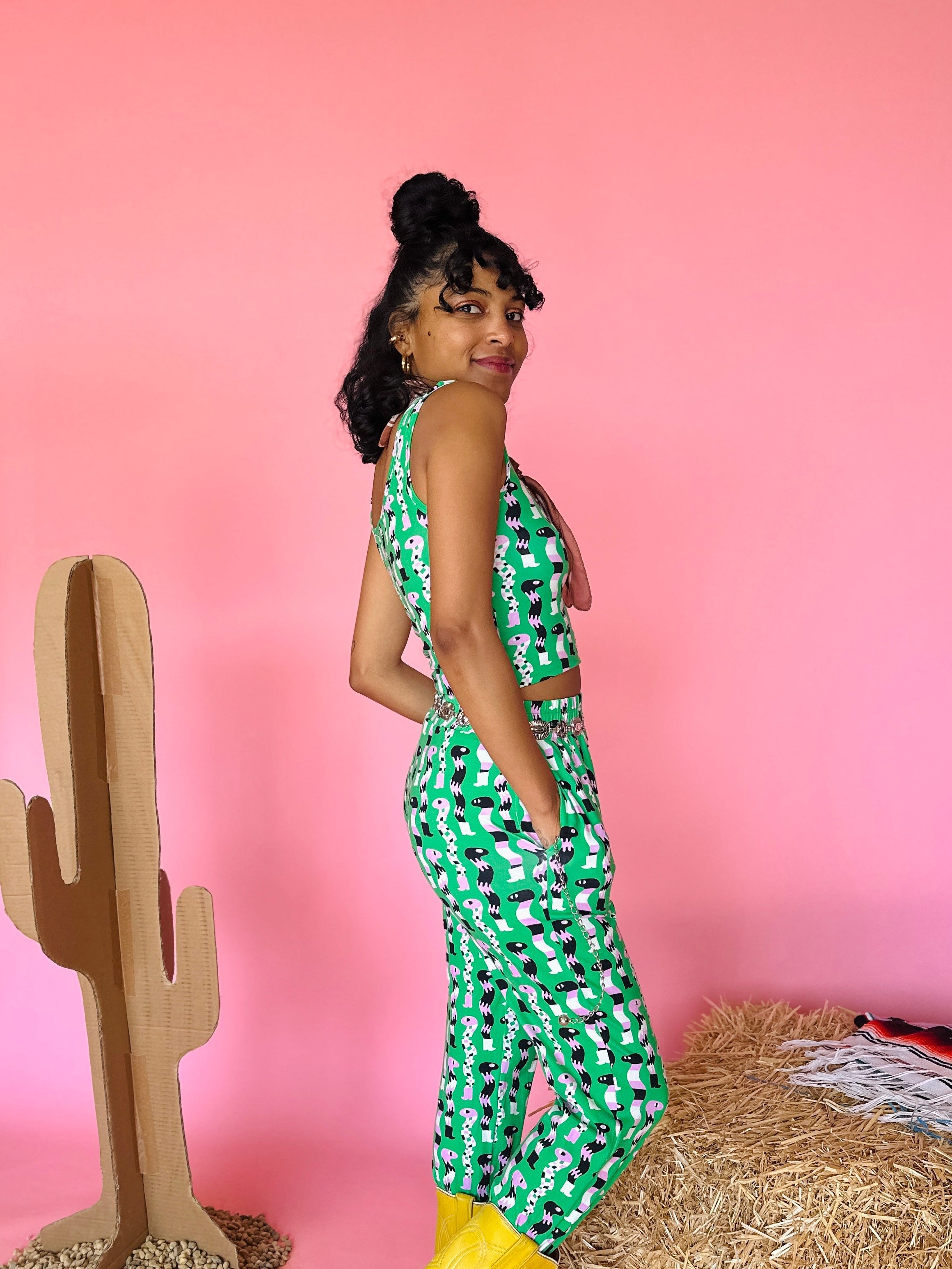 We are a woman owned, women run business. We make limited edition textiles with artists we love in cuts to make you look and feel good. All our garments are produced in California. We try to source all our materials in the USA and work with incredibly nice people.