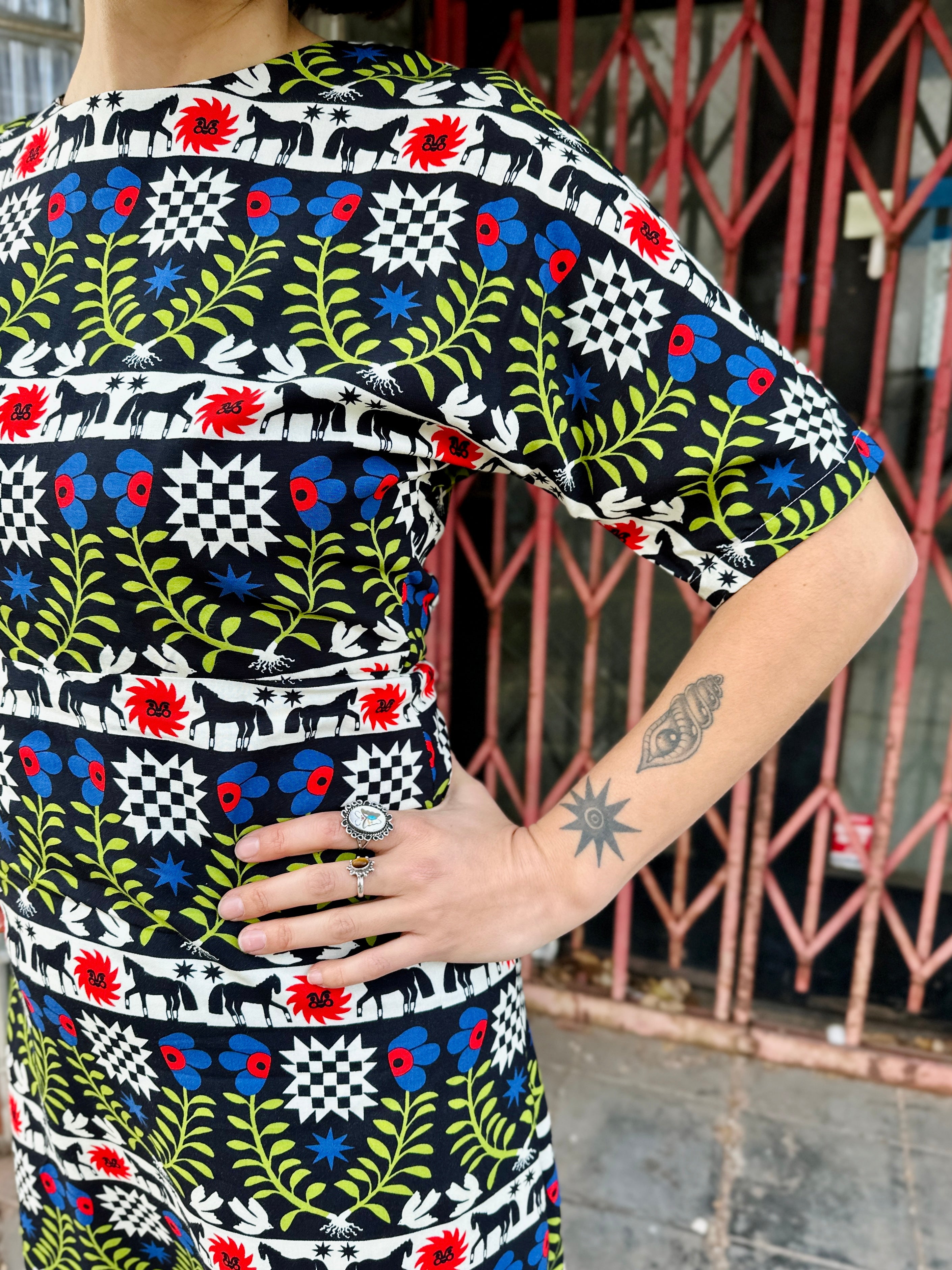 We are a woman owned, women run business. We make limited edition textiles with artists we love in cuts to make you look and feel good. All our garments are produced in California. We try to source all our materials in the USA and work with incredibly nice people.