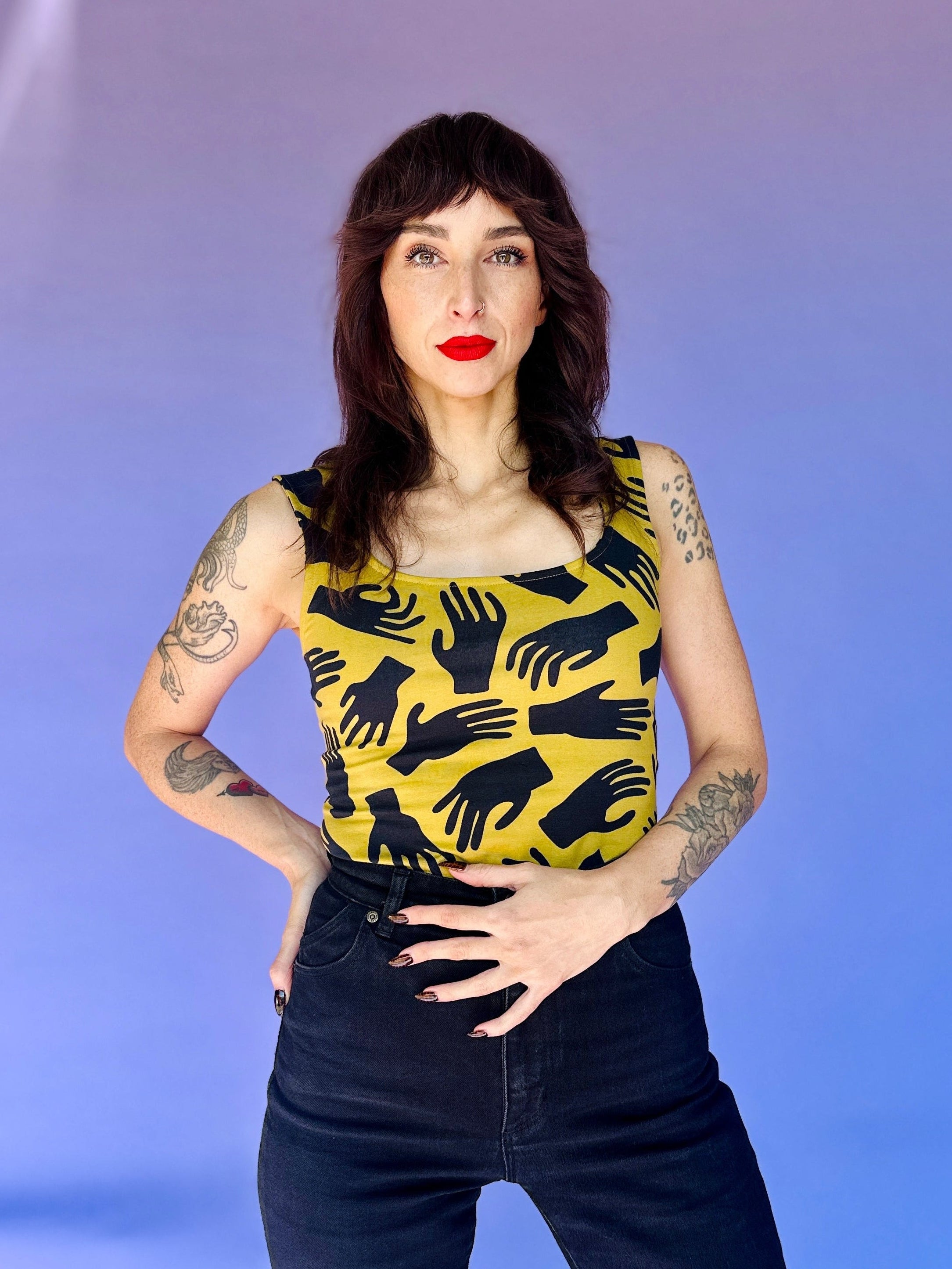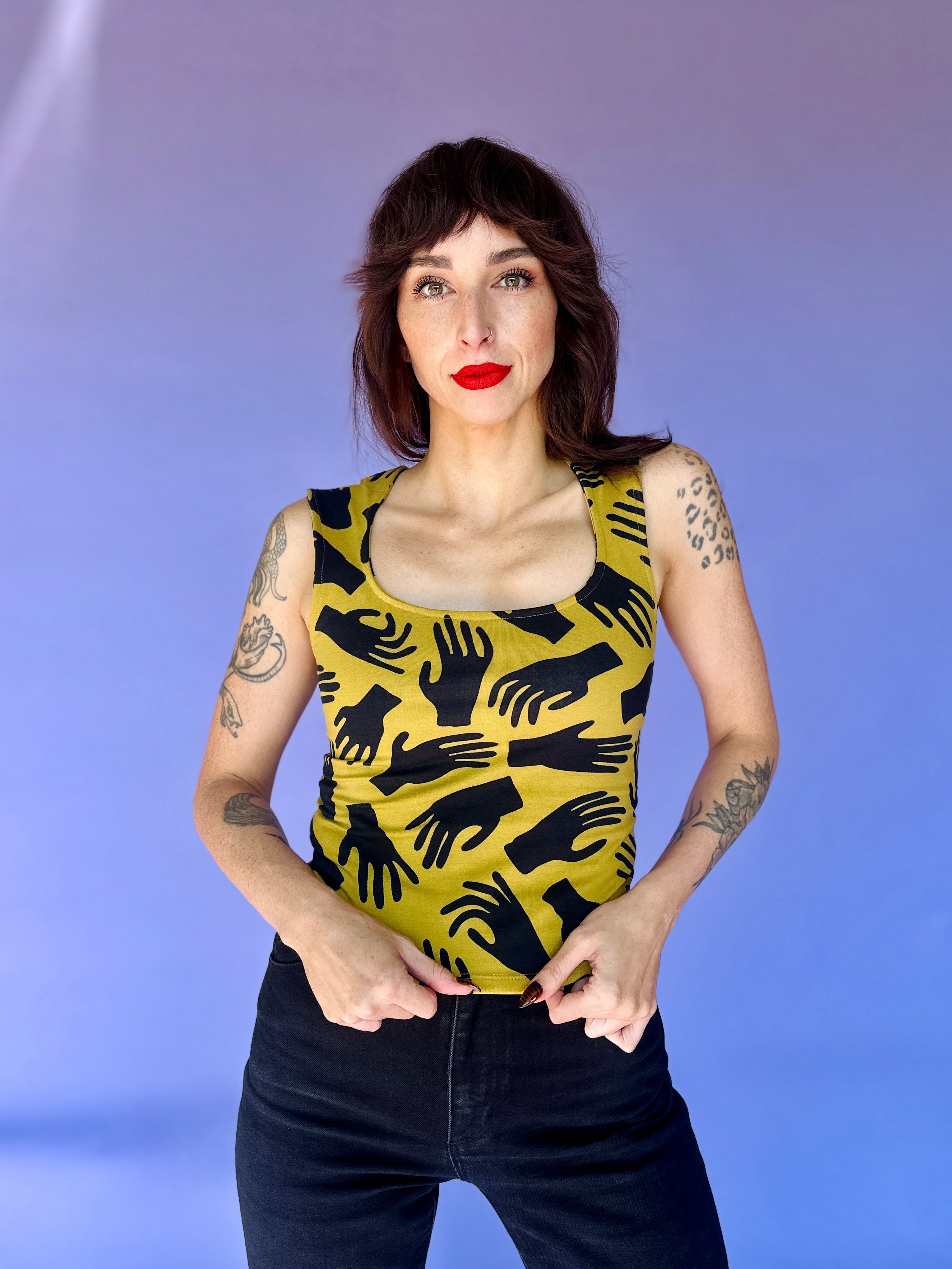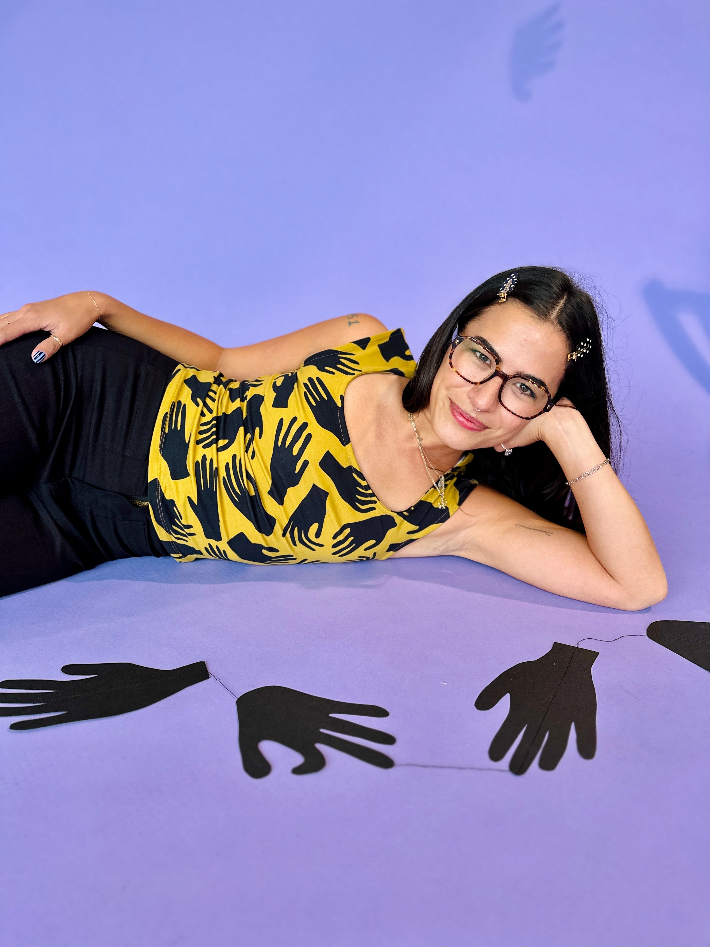 We are a woman owned, women run business. We make limited edition textiles with artists we love in cuts to make you look and feel good. All our garments are produced in California. We try to source all our materials in the USA and work with incredibly nice people.